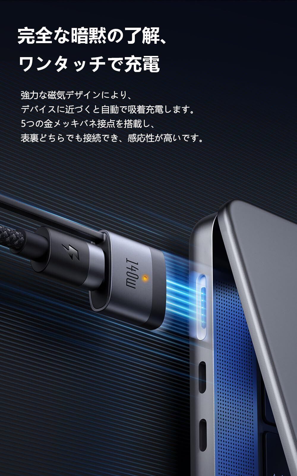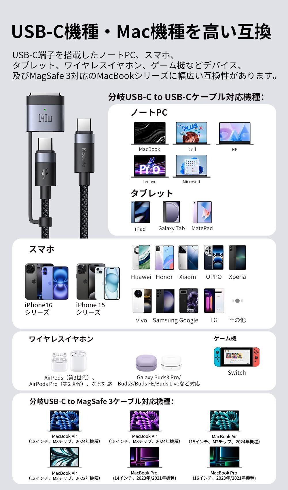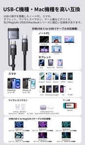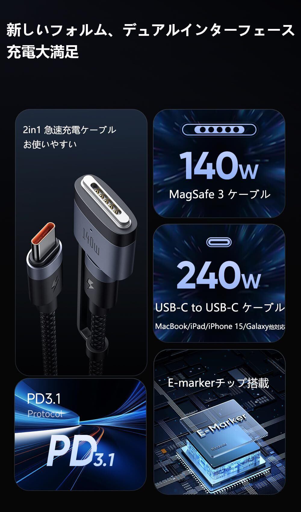 【240W / 140W USB-C to USB-C & Mag-safe 3 磁気充電ケーブル】:新しいフォルム、デュアルインターフェース。充電大満足。140W MagSafe 3 磁気充電ケーブル、240W USB-C to USB-C ケーブル。PD3.1 急速充電新規格を対応し、且つE-Markerチップを搭載して、最大140Wの出力でMacBook Pro 16“を約30分で55% まで充電します。ワンタッチで吸着、瞬間に急速充電。【Mac機種を互換】:MacBook Air(M2チップ、2022年機種)、MacBook Pro 14”(2021年/2023年機種)、MacBook Pro 16“(2021年/2023年機種)などMacの機種を対応します。本2in1急速充電ケーブルは、MacBook Pro/Air、iPad Pro/Air、iPhone 16/15シリーズ、Xperia/Galaxy/AndroidなどUSB-C機器を対応します。
