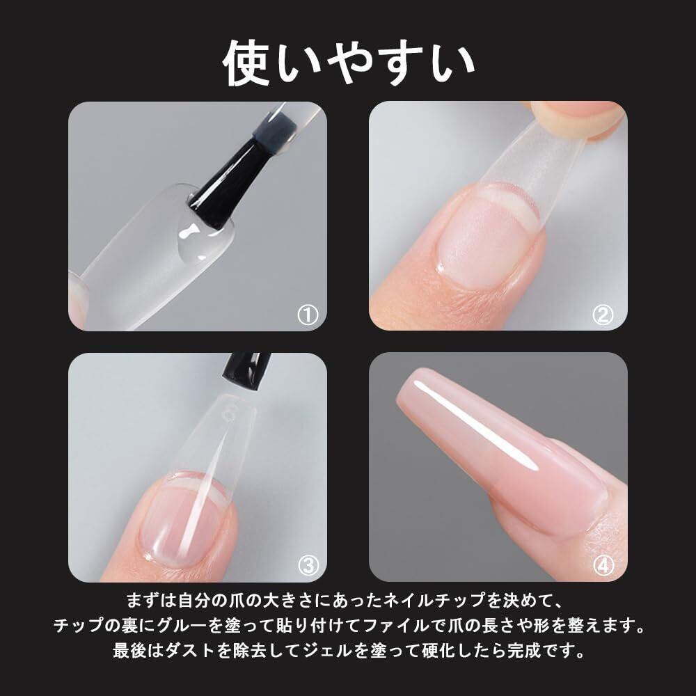 【使いやすい】まずは自分の爪の大きさにあったネイルチップを決めて、 チップの裏にグルーを塗って貼り付けてファイルで爪の長さや形を整えます。最後はダストを除去してジェルを塗って硬化したら完成です。
