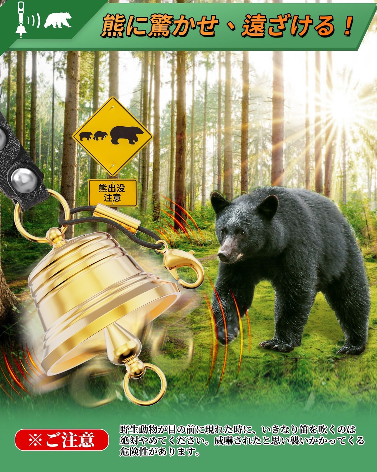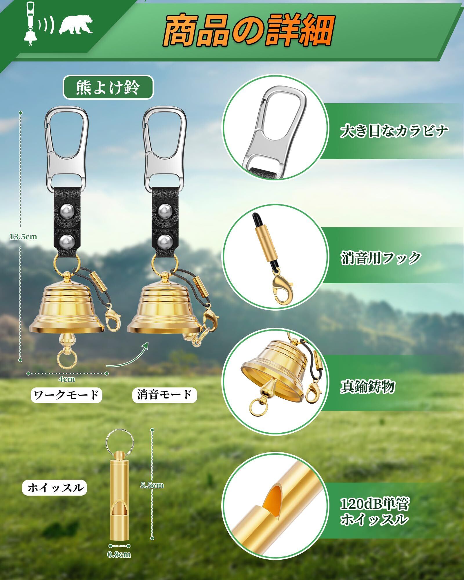 【熊からあなたを守る、最強の鈴が登場!】熊よけ鈴は、特定の音や震動の周波数が、熊などの野生動物に対して威嚇や驚きを与える効果があるという原理に基づいています。熊よけ鈴は、鈴の中に小さな金属のボールがあり、歩行や風などの振動によってボールが鳴ることで音が発生します。この音や振動が、熊や他の野生動物にとっての脅威となり、彼らを警戒させ、逃げるように促すとされています。