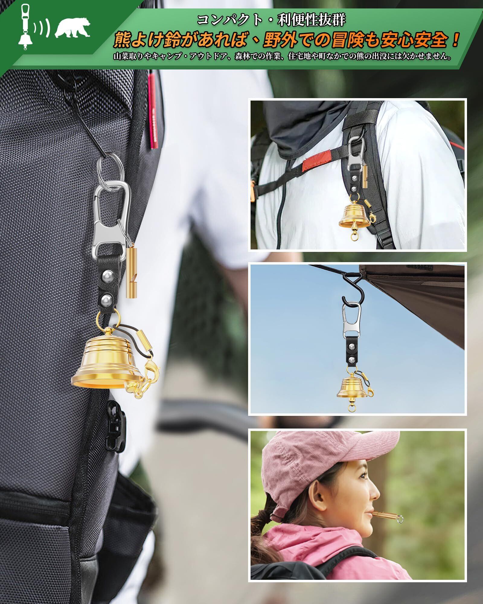 【熊よけ鈴で、自由にアウトドアを楽しみましょう!】クマよけ鈴はアウトドアでキャンプやハイキングなど、山岳地帯や森林地帯など、熊の生息地域に訪れる際に、農地や果樹園など場合にオススメ。セットのホイッスルは簡単に大きな音が出ますので体力を消費せずに遭難時等にこちらの居場所を知らせることができます。非常時・災害時用の備えとして安心です。