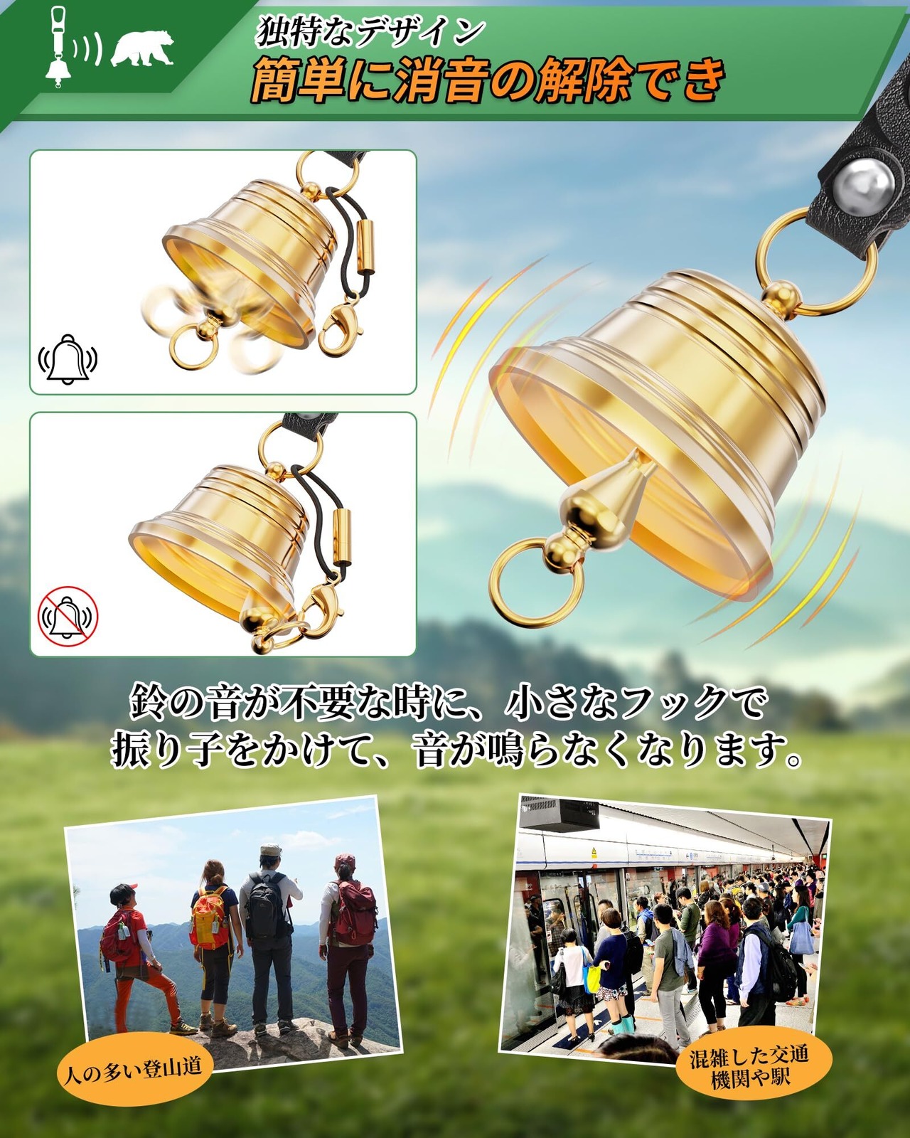 【静音モード、音なしでアクティブ】街中の移動時に音が気になる際は消音紐のフックをベルの振り子のリングに掛けることで、簡単に鈴の音を止めることができます。