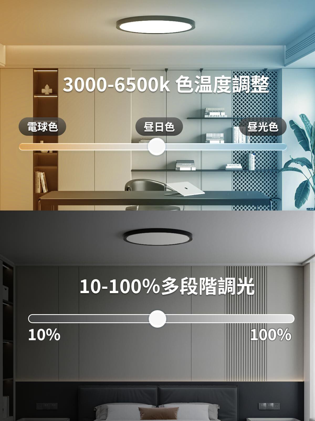 【10段階調光&7段階調色&5種類の色温度ワンタッチ変換】 電球色/昼白色/昼光色/常夜灯/常夜灯+昼白色+昼光色など、自由に変換できます。現在、新しくアップグレードされ、常夜灯と昼白色が同時に点灯するようになり、光がより明るく透き通るようになりました。リビングルーム/キッチン/寝室/書斎など、さまざまなシーンに適しています。