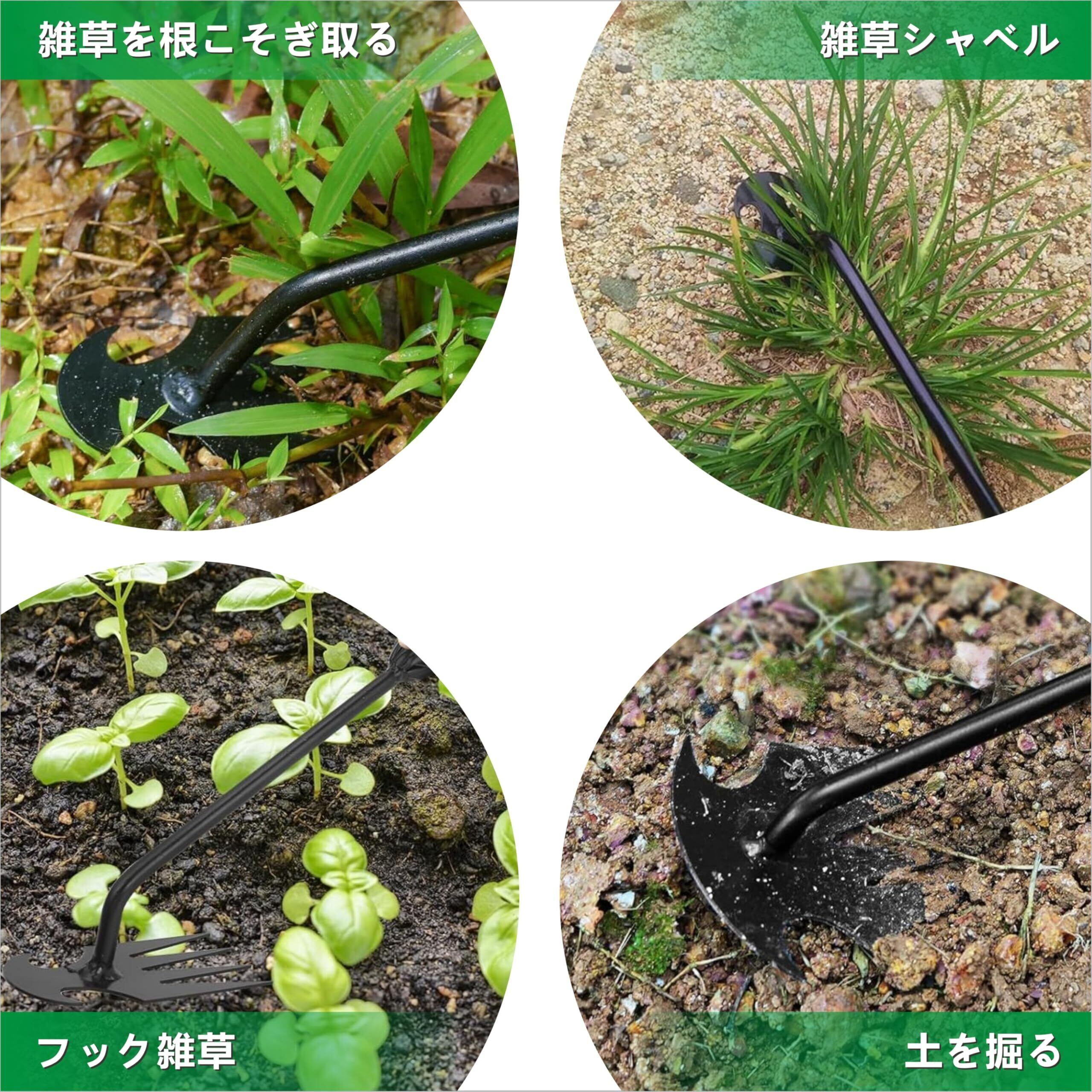 【両用除草ツール】4本歯と先の鋭利な刃との2in1で、深めの雑草や根を切ったりしつつ、引っこ抜く作業もとてもしやすく、使いやすいです。 4本の鋭い歯を草の根元にできるだけ近い土に差し込んで引っ張るだけです。また、刃先を地面に差し込み、そのまま持ち上ける事で草が抜けます。葉が放射線状に広がっている雑草を抜く際に効率的です。