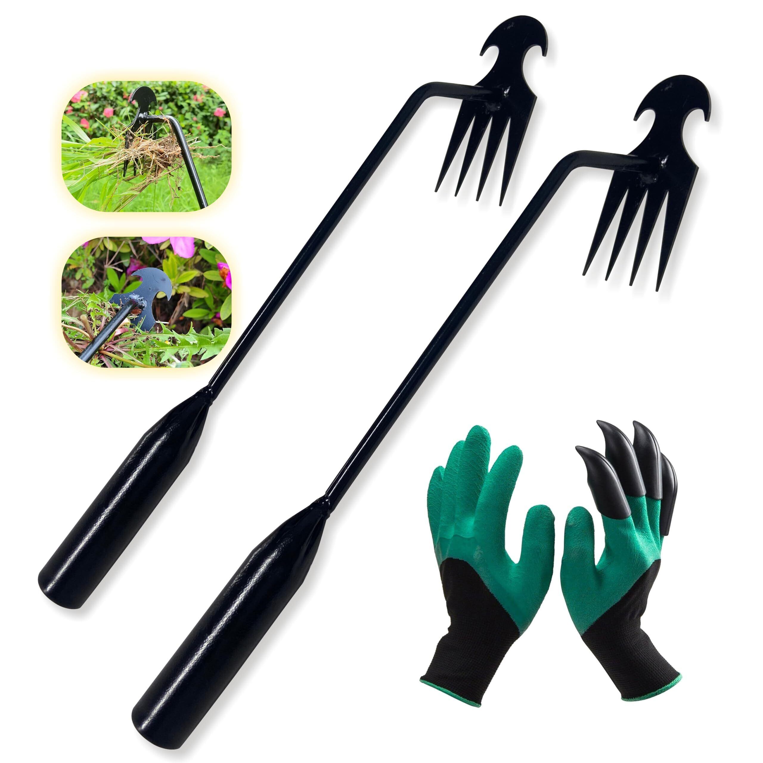 Rachil 草取り道具 雑草ブラシ 雑草抜き 雑草取り道具 雑草除去ツール 園芸用品 掘り起こし道具 草刈りかま 草取り器 4歯 超軽量 (草取り道具2本+園芸用手袋1組)