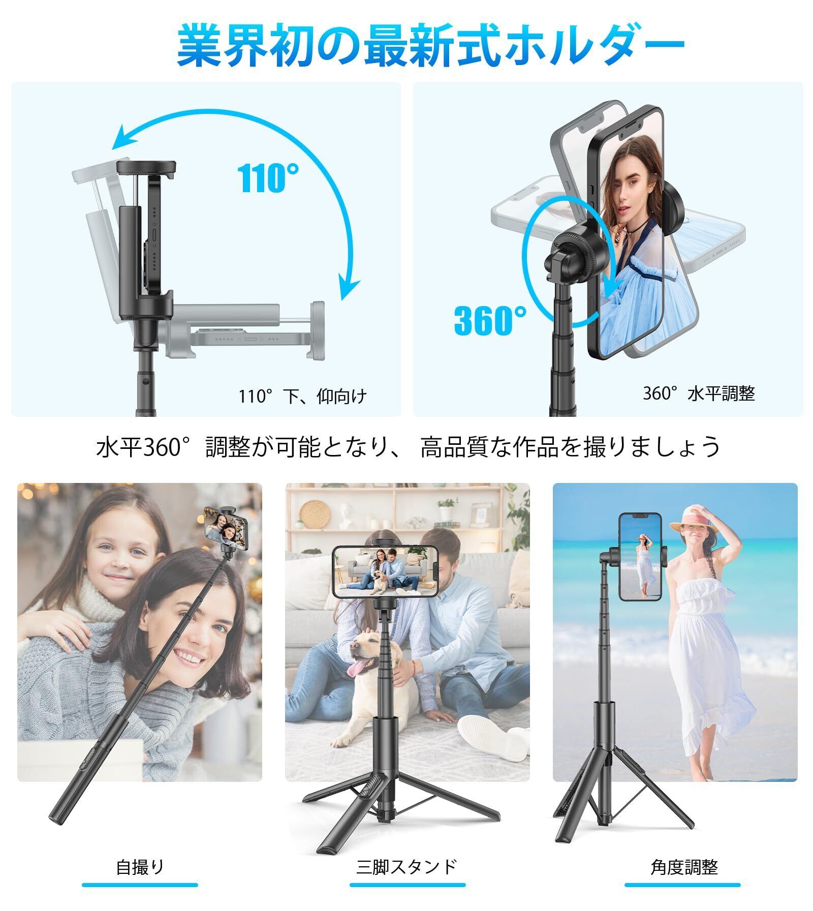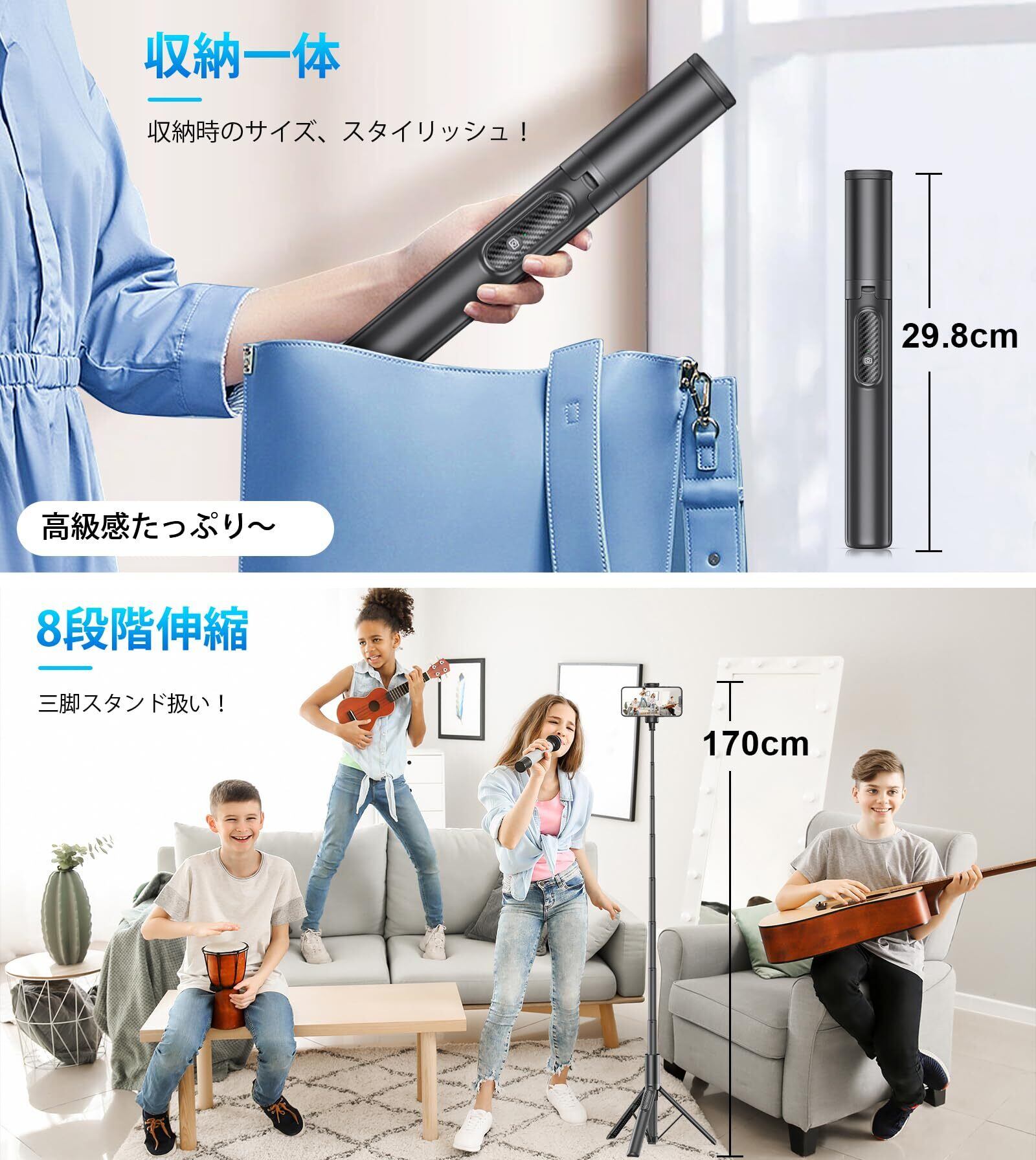 自撮り棒&三脚でさらに多機能: 29.8cmから170cmの長さで自由自在に撮影できる自撮り棒がさらに進化しました!さらに、付属の三脚機能も搭載しており、じどり棒を使って固定撮影も可能です。軽量かつコンパクトなデザインなので、旅行やアウトドアでの撮影にも最適です。充電式リモコンでカメラのコントロールも簡単!一人でのセルフィー撮影から風景やグループ写真まで、あらゆるシーンで使える便利なアイテムです