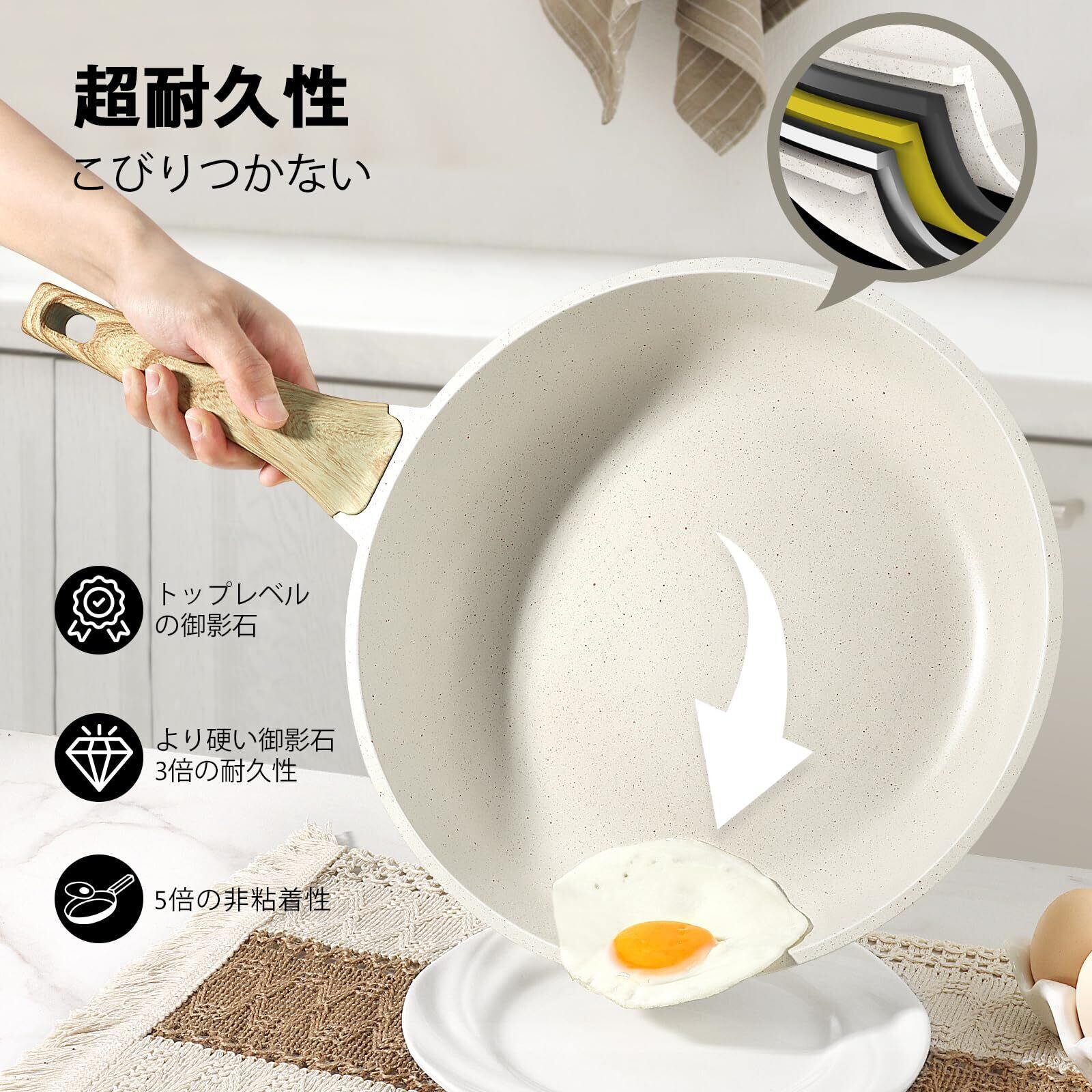 環境に優しいノンスティックコーティングフライパン - 5倍の超ノンスティック性能、SGS承認、PFOS/PFOAフリーの組成を備えた環境に優しい御影石調理器具で、より健康的で手間のかからない料理を体験してください