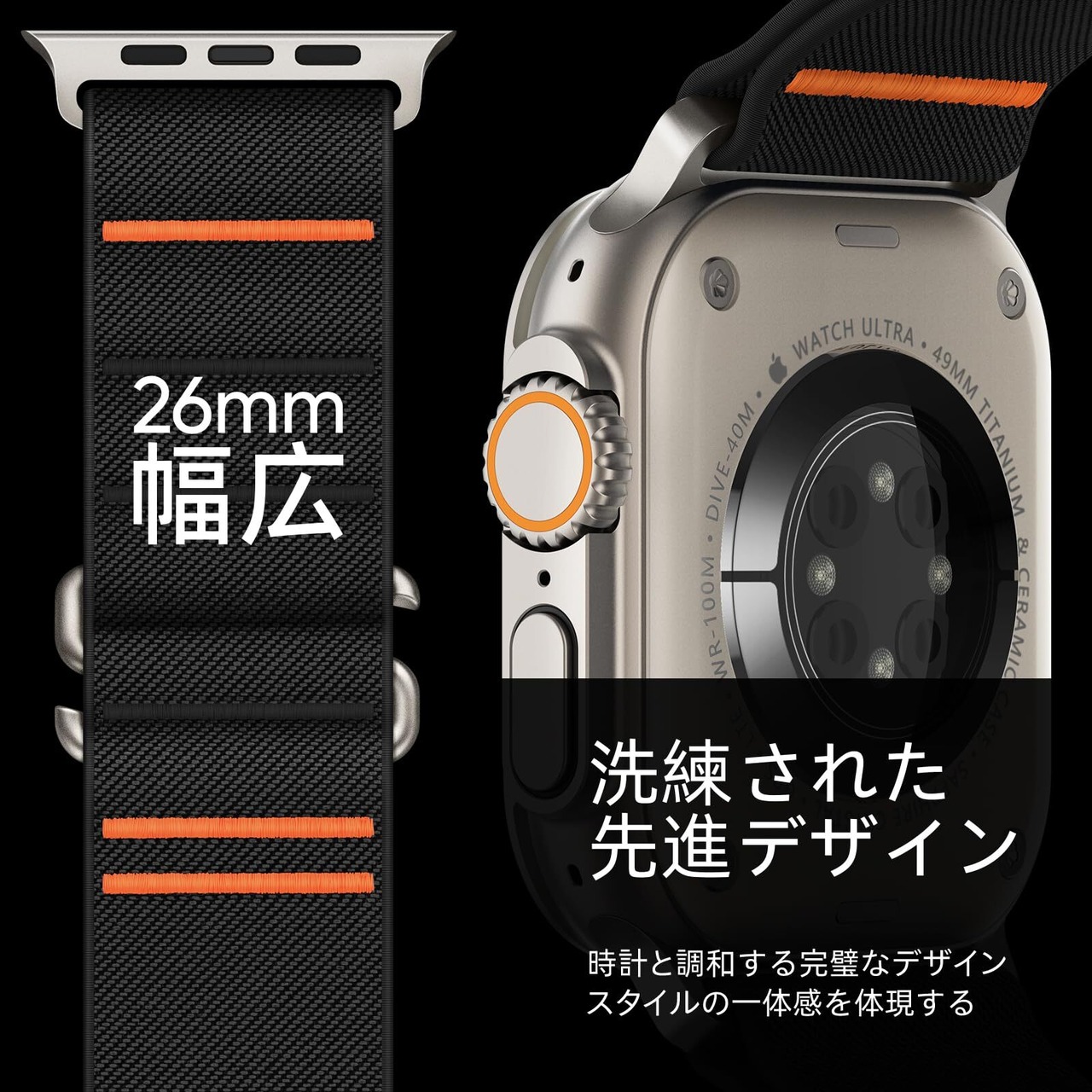 【洗練されたデザイン】職人技を込めて、丁寧に作り上げた26mm幅広のApple Watchバンド。外観のアクセントとなるオレンジのラインは、配色と個性を際立たせて、Ultraの色調にも似合って、スタイルと機能性を兼ね備えています