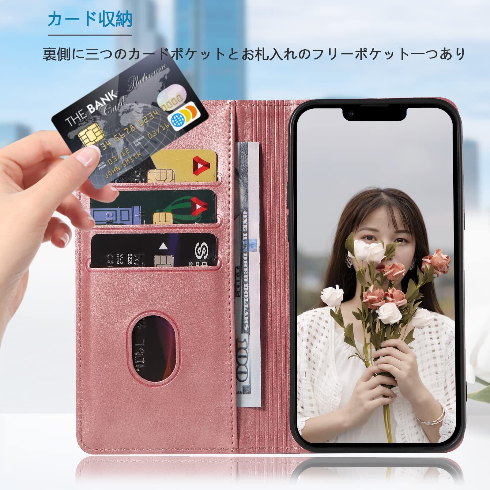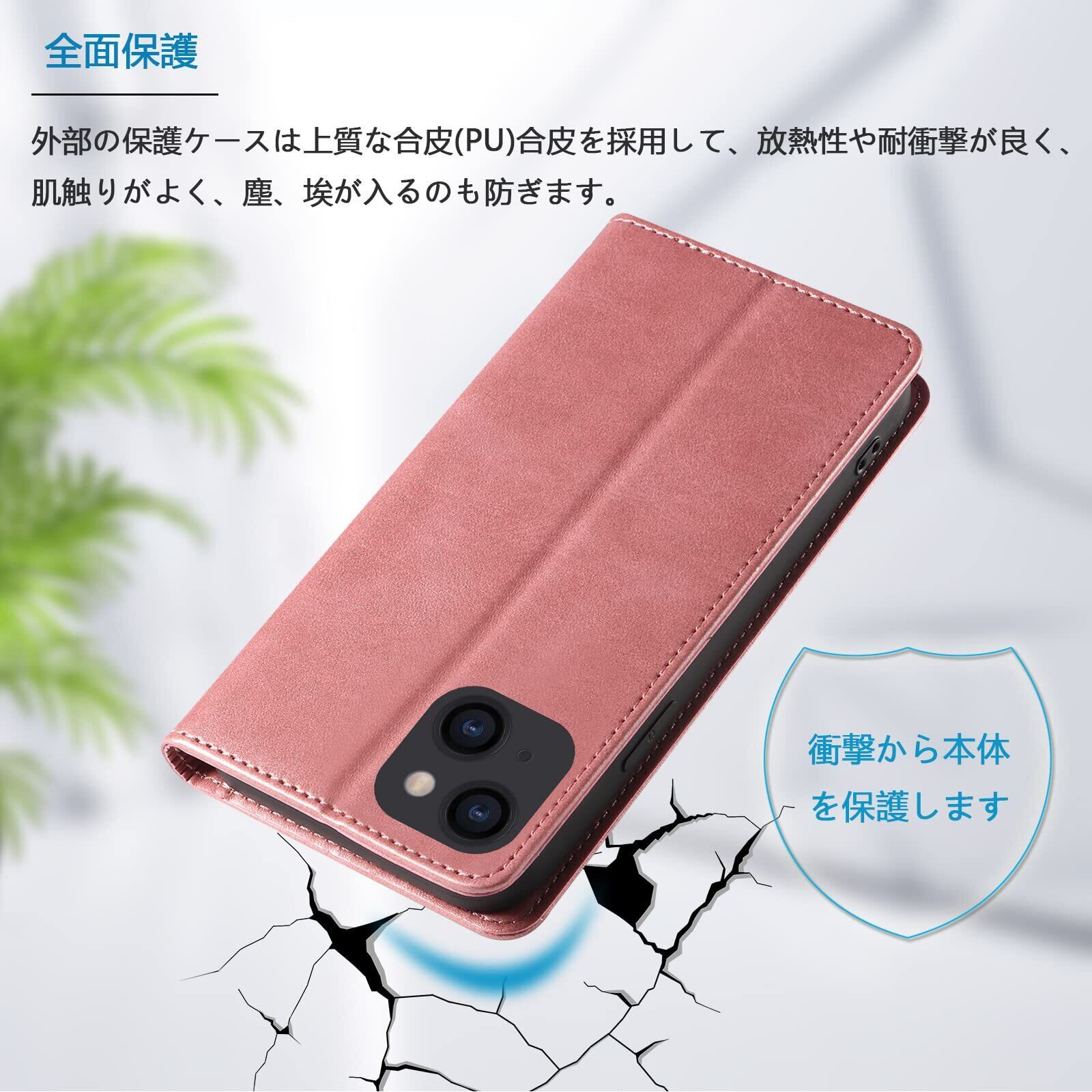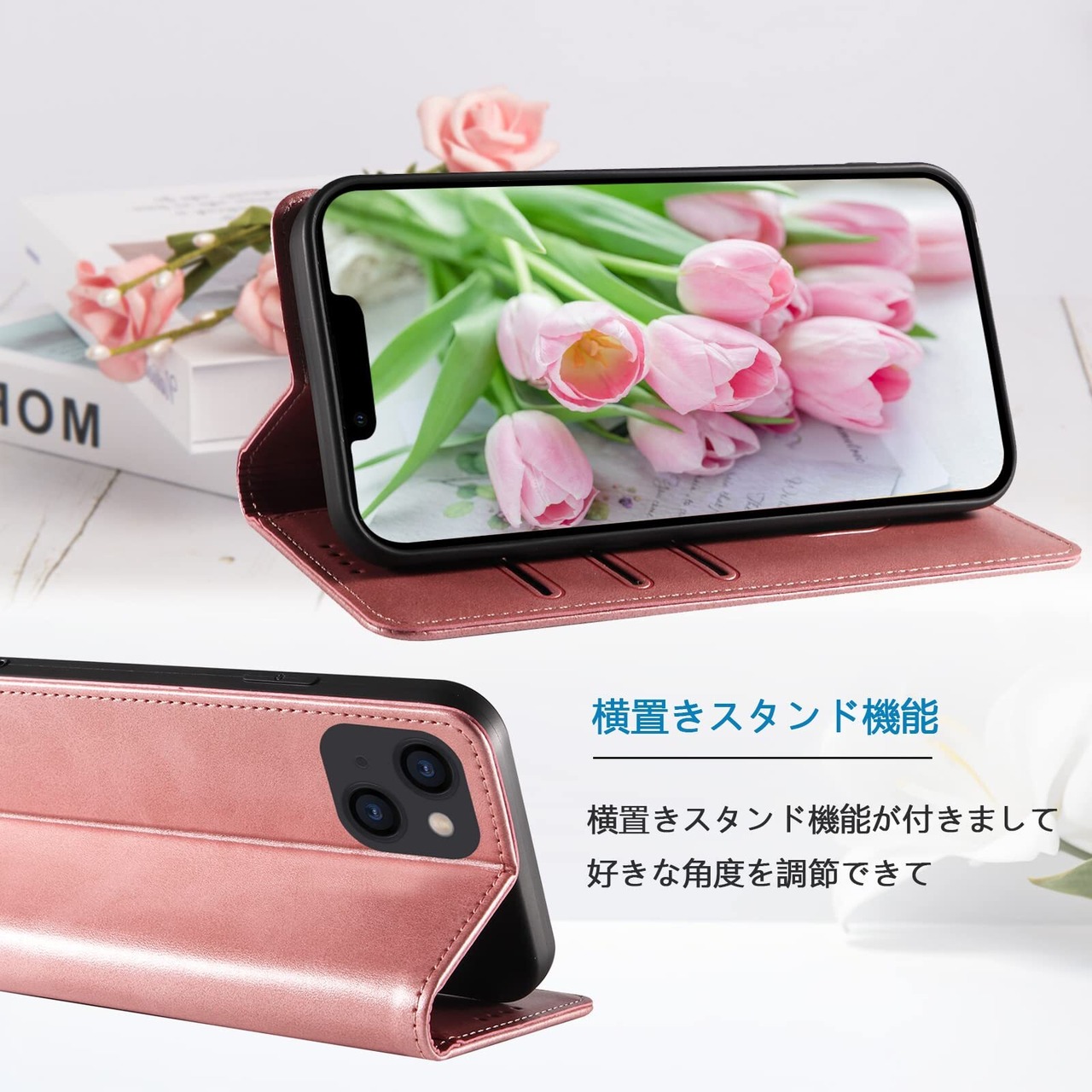iPhone14 ケース イフォン14 スマホケース 手帳型 携帯カバー レザー 耐衝撃 軽量 着脱しやすい 放熱性 マグネット式 カード収納 スタンド機能 iphone ケース14 対応 360度保護 PinLiSheng (バラゴールド iPhone14)