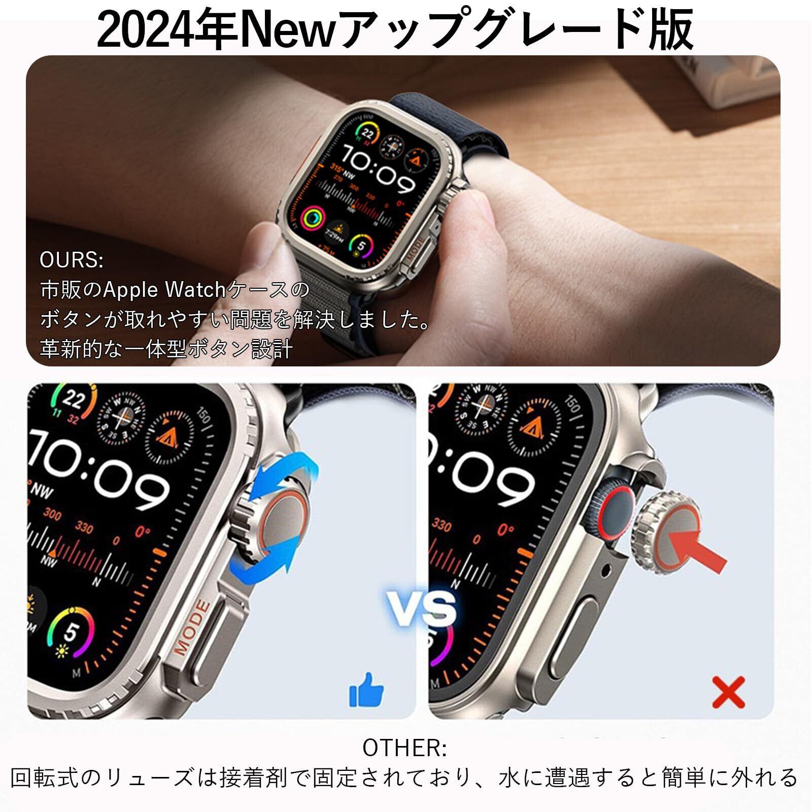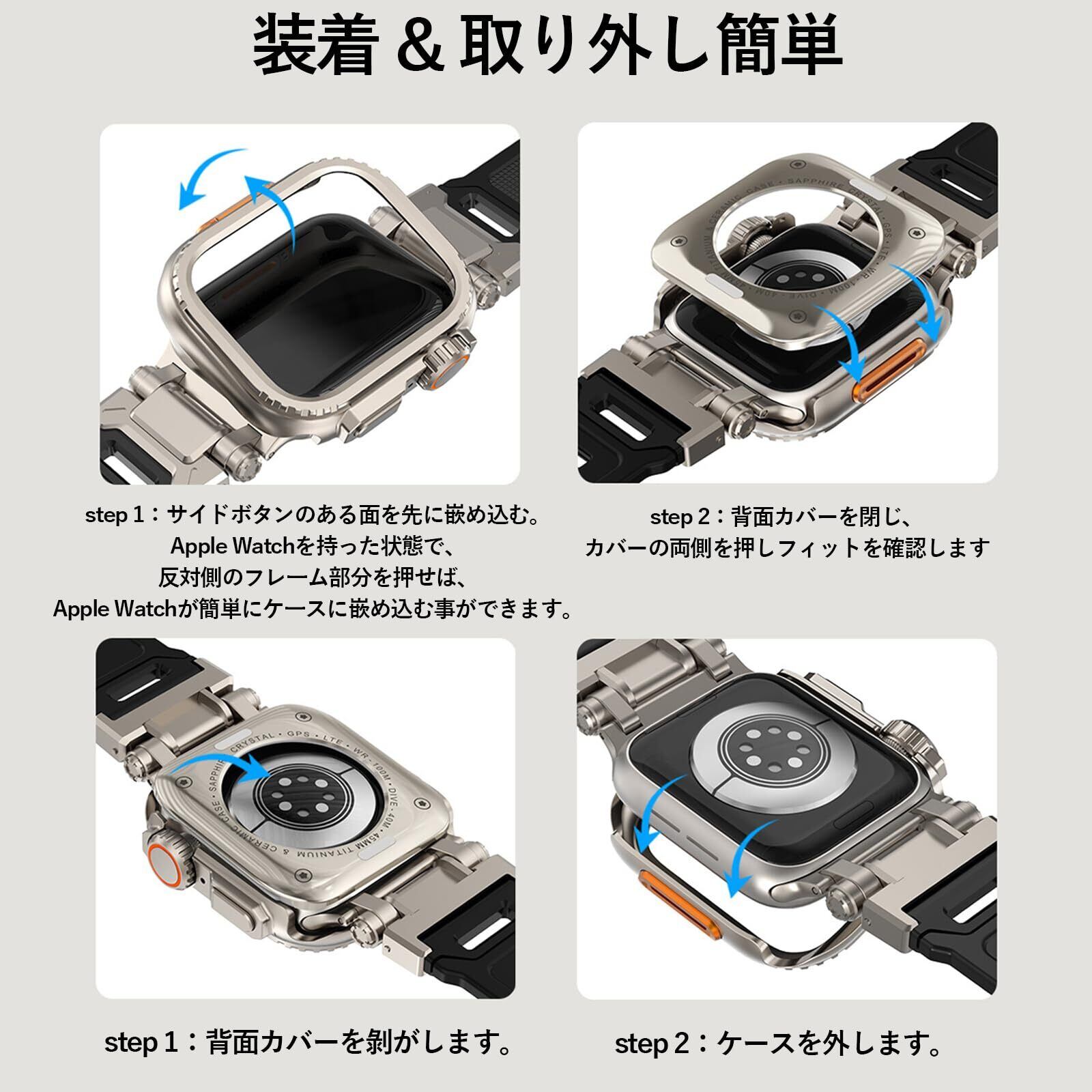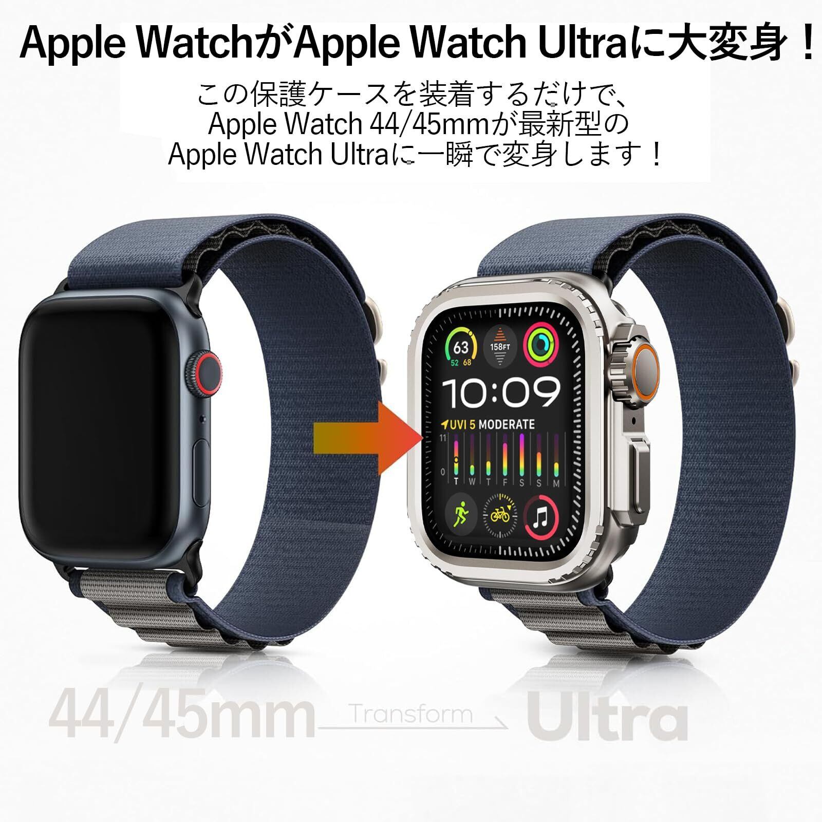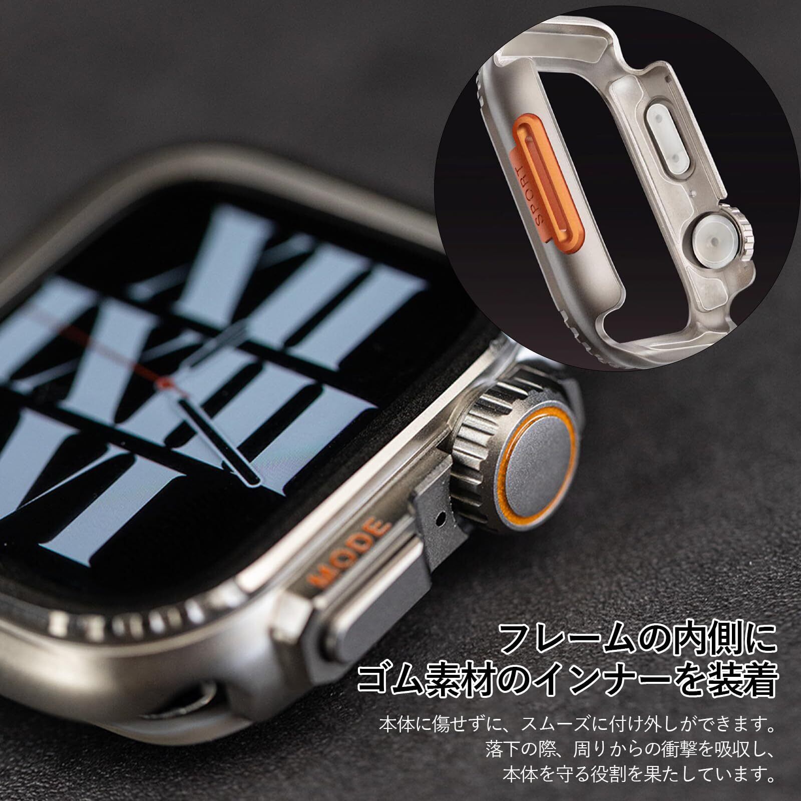 【Apple WatchがApple Watch Ultra/Ultra 2に大変身!】この保護ケースを装着するだけで、Apple Watch Series 9/8/7 45mm Apple Series 6/SE/5/4、44mmが最新型のApple Watch Ultraに一瞬で変身します!本製品は、Apple Watch Ultra/Ultra2の色と外観を高度に再現しており、Apple Watch Ultra/Ultra2の雰囲気を体感いただけます。このケースであなたのApple Watchに新鮮な感覚とおしゃれをもたらします。(*本製品は、Apple Watch Series 9/8/7 45mm Apple Series 6/SE/5/4、44mm用の保護ケースであり、Apple Watch Ultra/Ultra2の保護ケースではありません。)