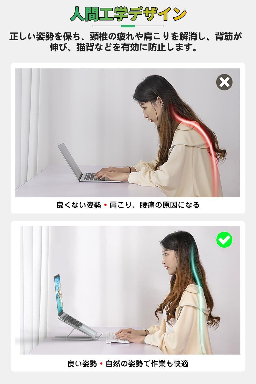 【人間工学設計&6段階高さ調節可能】ノートパソコンスタンドは人間工学デザインにより、視線が高くなり適正な姿勢に、肩や腰や首など負担を軽減してくれて、猫背などを有効に防止できます。長時間のノートパソコン作業時に傾斜角度約15°~45°の6段階を調整可能、自身に合わせて最適な姿勢で気楽に仕事場を作り、デスクワークがもっと快適になります。注意:パソコンスタンドを最大の角度まで伸ばしてから使用します。
