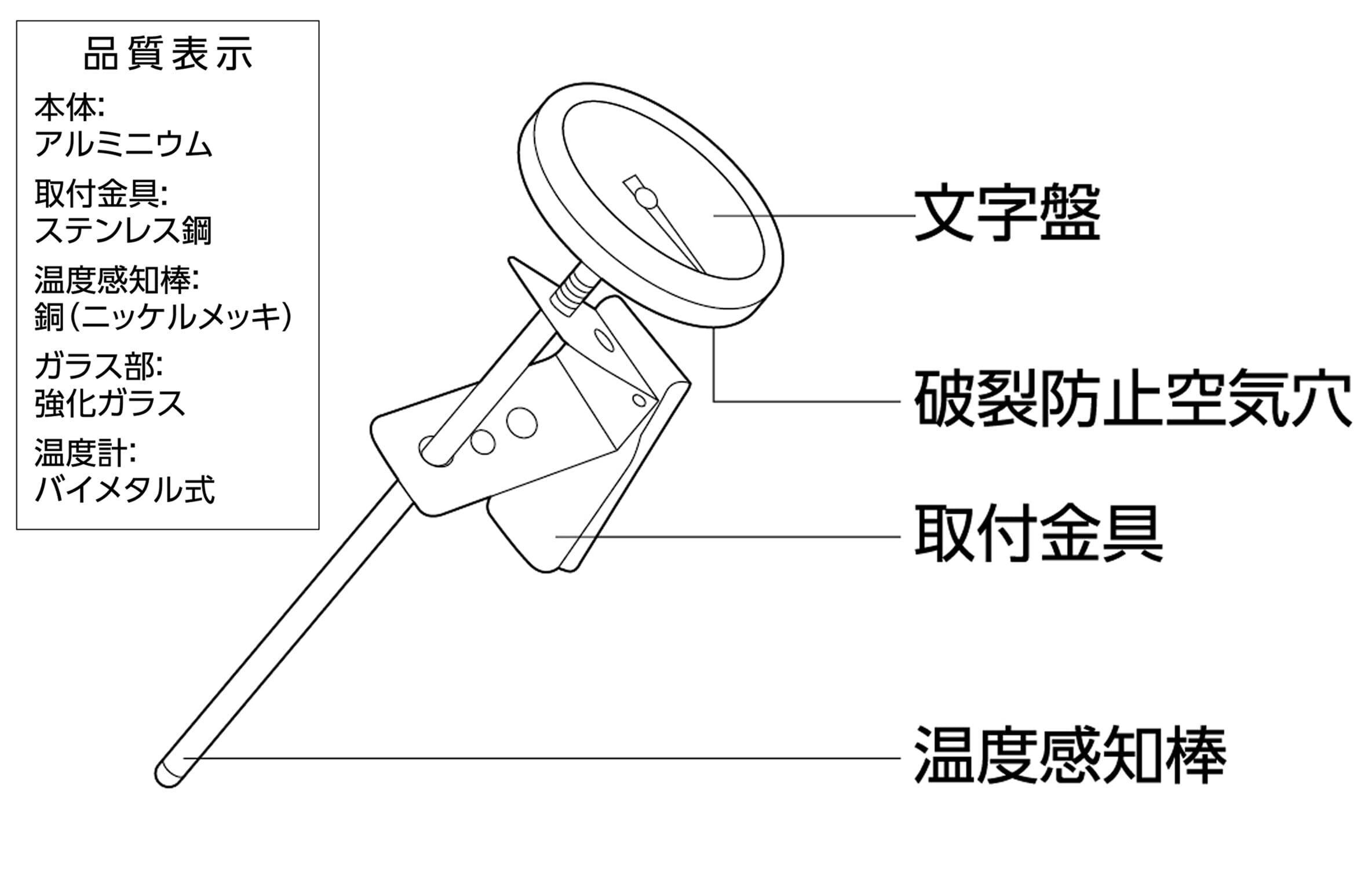 【材質】本体:アルミニウム、取付金具:ステンレス鋼、温度感知棒:銅(ニッケルメッキ)、ガラス部:強化ガラス、温度計:バイメタル式