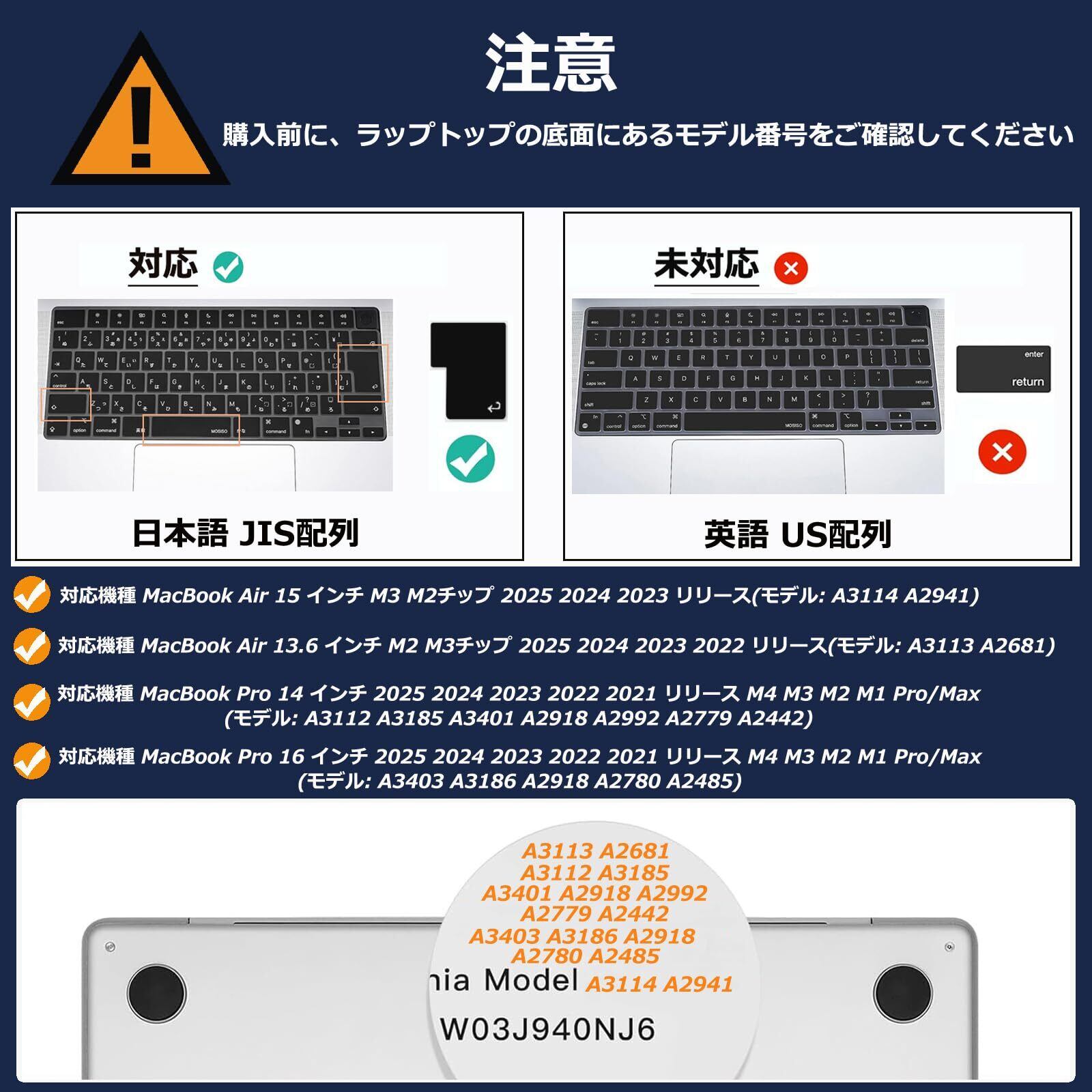 【対応機種】対応機種 MacBook Air 15インチ M3 M2チップ 2023 2024 2025リリース(モデル: A3114 A2941)、対応機種 MacBook Air 13インチ M2 M3チップ 2025 2024 2023 2022 リリース(モデル: A3113 A2681)、対応機種 MacBook Pro 14インチ 2025 2024 2023 2022 2021 リリース M4 M3 M2 M1 Pro/Max(モデル: A3112 A3185 A3401 A2918 A2992 A2779 A2442)、対応機種 MacBook Pro 16インチ 2024 2024 2023 2022 2021 リリース M4 M3 M2 M1 Pro/Max(モデル: A3403 A3186 A2918 A2780 A2485)のみ対応します。注意:このケースは他のモデルのラップトップと互換性がありません。