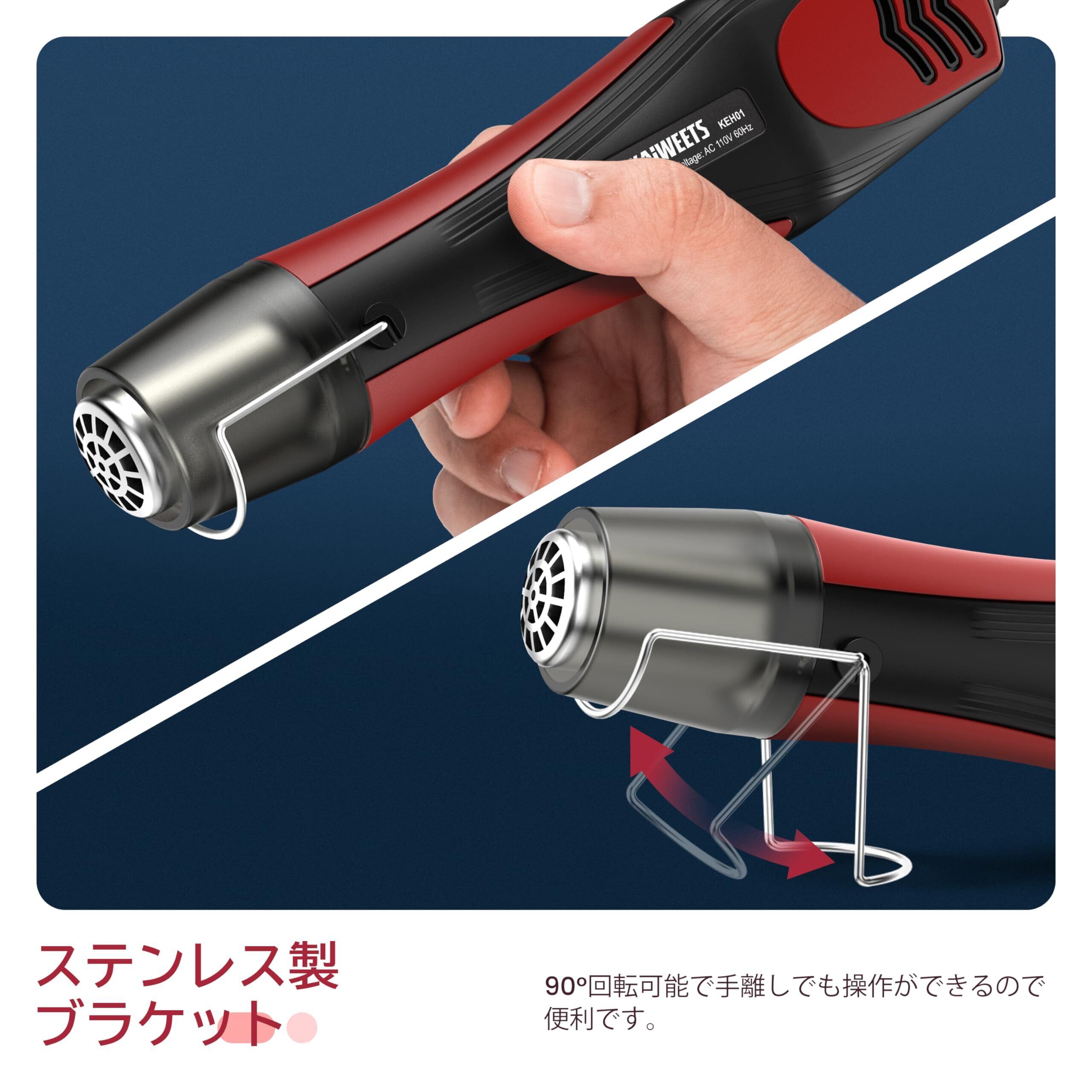 【便利なデザイン】折りたたみ式スタンドが熱風機本体に付属しており、横置きの状態に両手を使って作業可能です。フックのようなノズルは全方位から熱を加えることが出来、熱収縮チューブやプラスチック棒を温めて曲げたりするような熱処理加工作業のに適用。