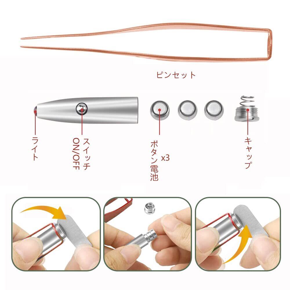 【LEDライト付】:LEDライトの明るい光で、暗い耳穴を照らしながら耳掃除ができるピンセット&耳かきセット。奥まではっきりと見えるので、耳垢を目視しながら的確に耳掃除が可能です。夜間の耳掃除にもおすすめです。お子様用やお年寄り用に最適、家庭用としても大変便利です。