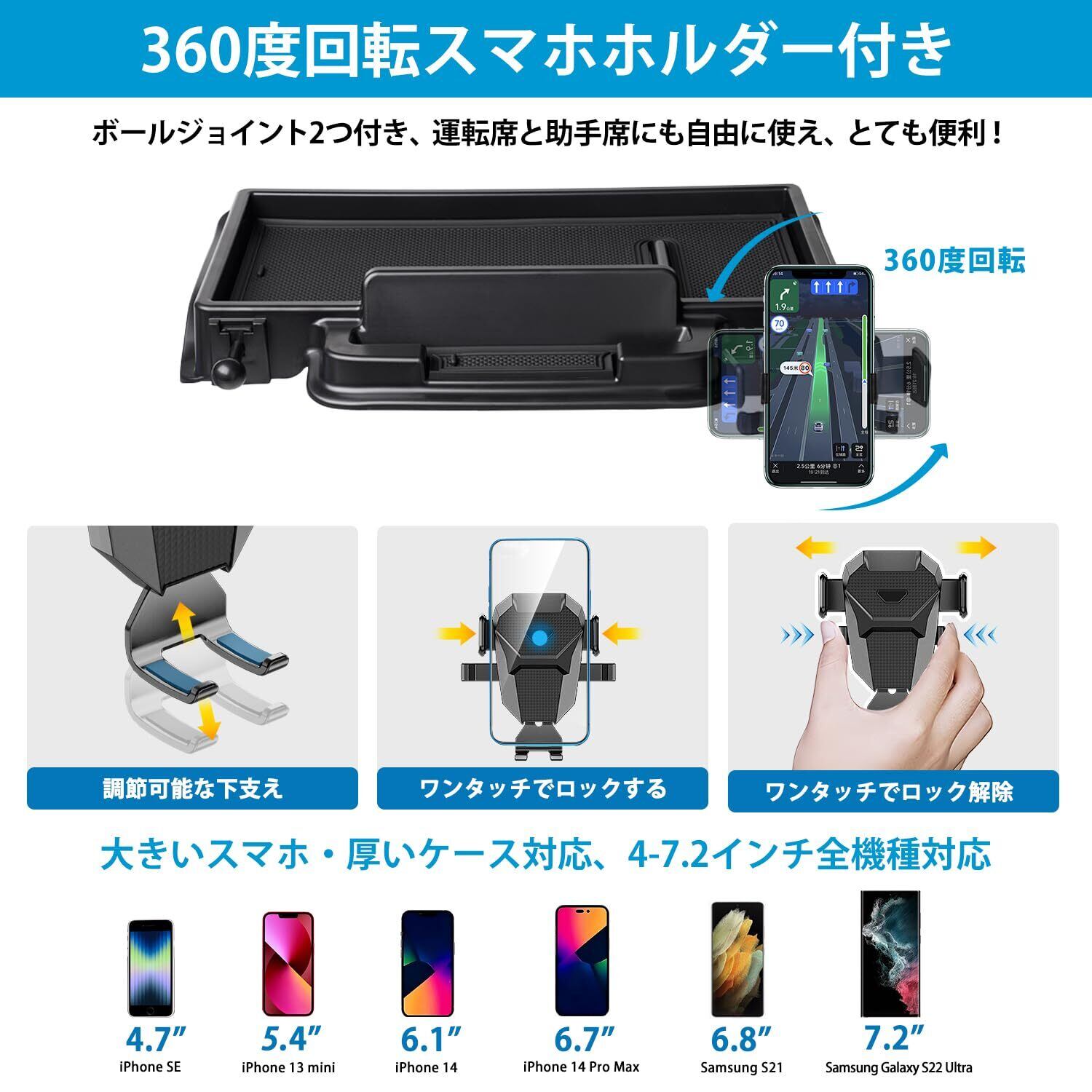 3.【360度回転スマホホルダー付き】:この商品は運転席用のスマホホルダーだけでなく、助手席用の360度回転ホルダーも追加され、スマホ本体を固定する部分は360度回転できます、ロングアームでレバー等の干渉を避け、見やすい位置へ調整可能できます。【幅広い機種対応】スマホホルダーはコンパクトと機能性を兼ね揃えた車載ホルダーで、 4-6インチのスマホに適用しています。iPhone 13 / 12 /11 promax/ iPhone XS MAX / iPhone 8 Plus / 7 Plus / 6 Plus、または Galaxy S8 Plus / huawei / Xiao Mi / Xperia / Google Pixelなどの機種に対応可能です。(※注意:11 Pro/ iPhone X / XS / XS/iPhone SE / SE 2/iPhone 8/iPhone 6/Galaxy S8などの機種に対応する可能ですが、スマホケースを装着しないスマホには、ご利用の場合、音量ボタンが押されてしまうかもしれません。ご了承ください。)