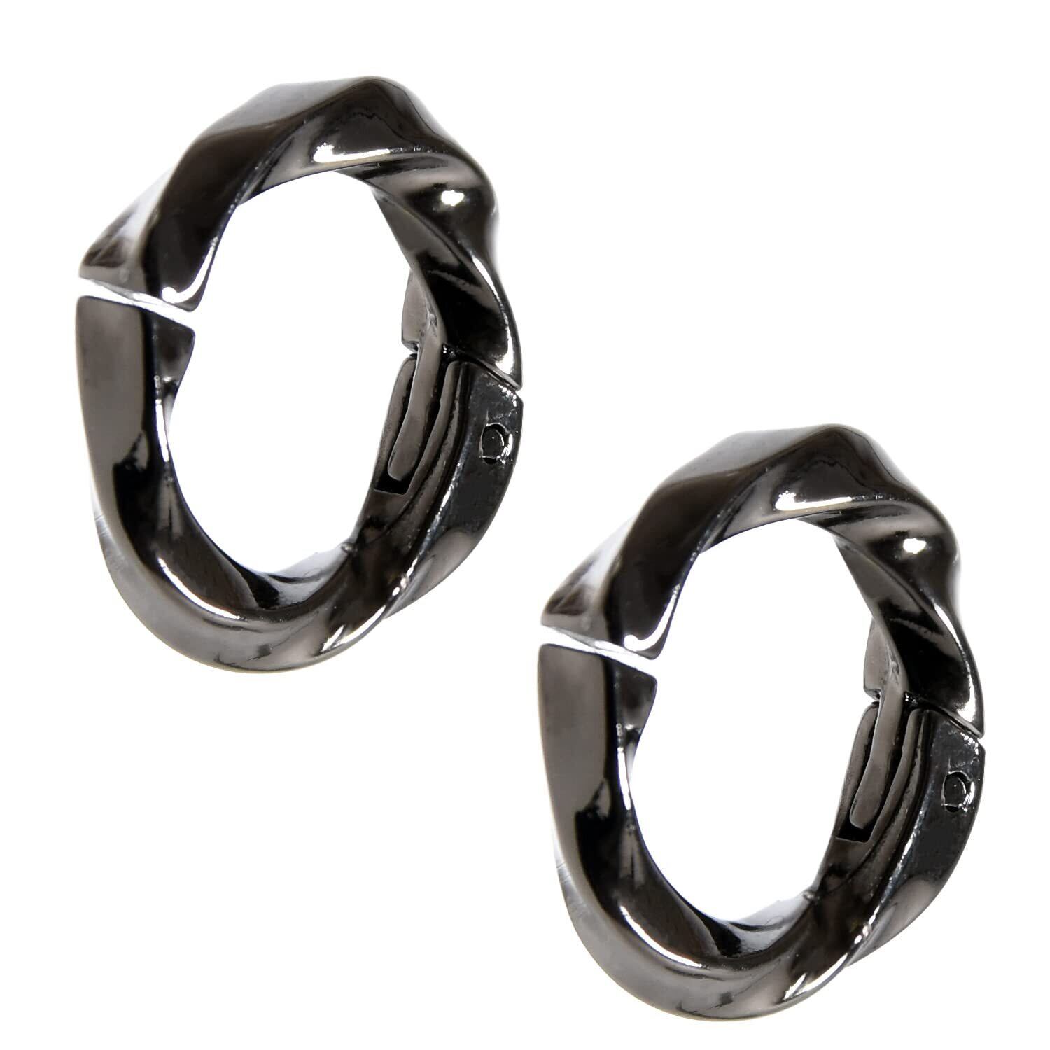 【 おしゃれなデザイン 】フープタイプにツイスト(ねじり)を加えどの角度から見てもキラキラと高級感のある輝きを放つツイストフープイヤリング、シンプルなフェイクピアスに飽きてしまった方や周りと差をつけたい方におすすめのアクセサリーです。ツイストフープフェイクピアスはメンズだけではなく、レディースにもお使いいただけます。光の反射により輝きを放ち、ねじりを効かせたデザインがあなたの耳元をおしゃれに演出します。耳に直接触れる部分は耳への負担が少なく外れにくい平らなフラット加工をしております。フープイヤリングのサイズは外径15mm 内径10mmフープイヤリングの厚さは約2.5mm 重さは約1グラムになります。カラーはシルバー ブラックからお選びください。