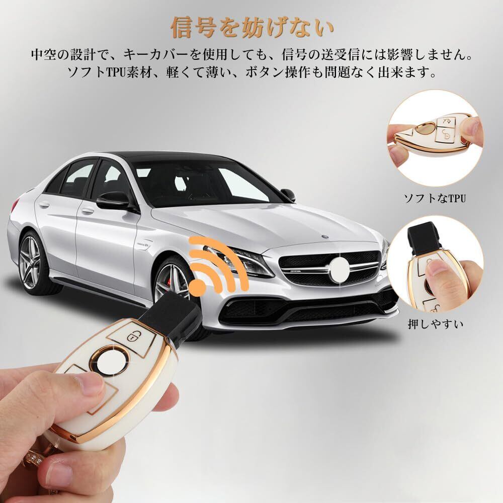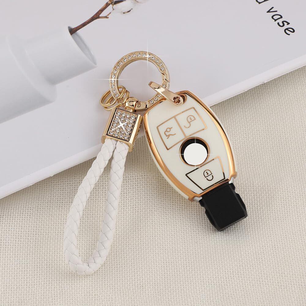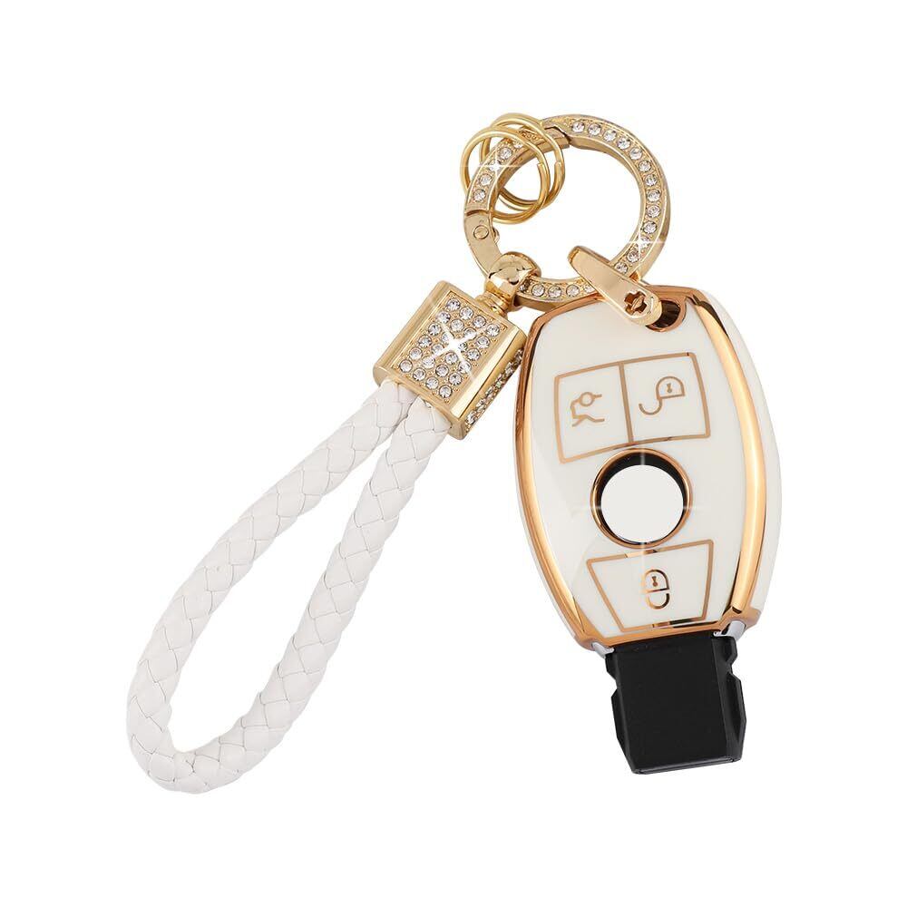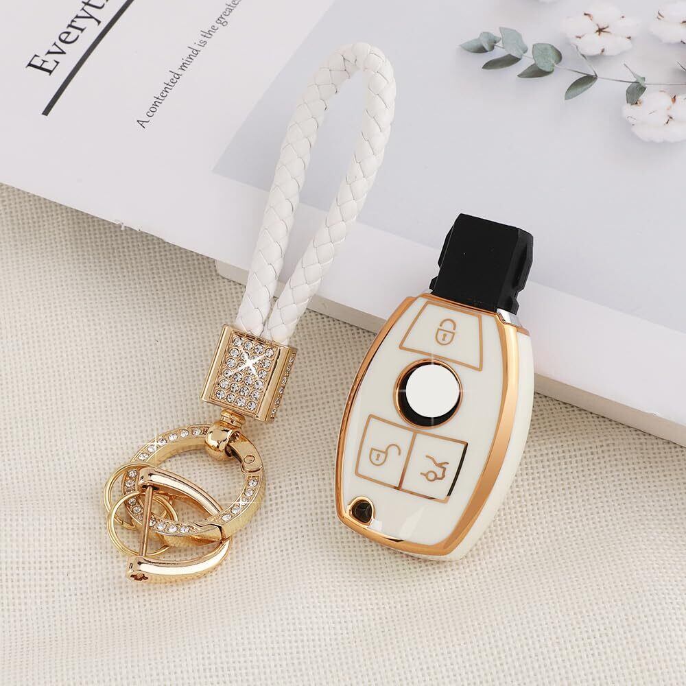 [Catland] ベンツ キーホルダー キーケース 3ボタン メルセデス専用A B C E クラス CLA GLA GLC GLE 鍵 キーカバー スマートキーケース キーチェーン ドレスアップ パーツ アクセサリー 工具付き クリーミーホワイト ゴールデンエッジ
