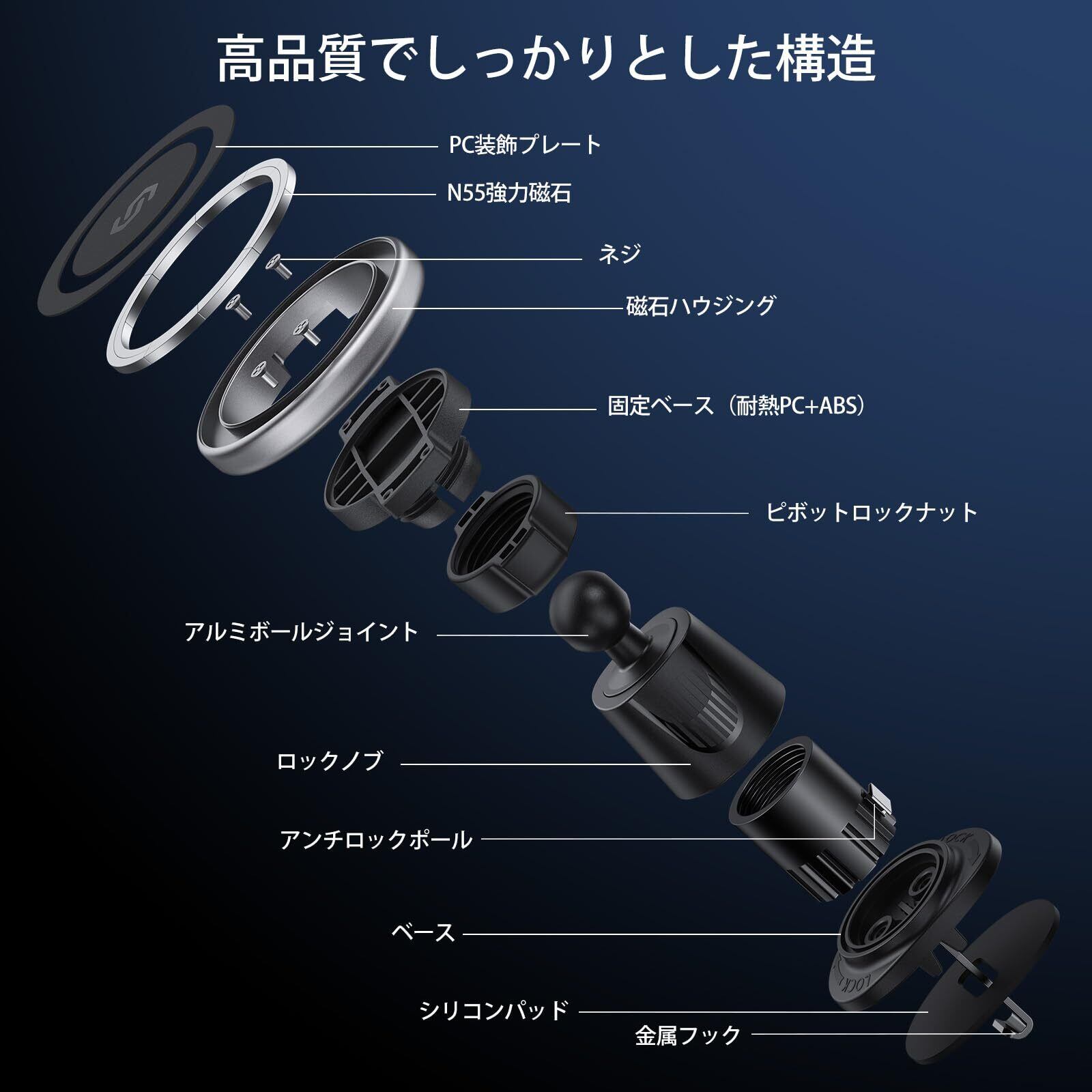 超強力磁力:MagSafe対応iPhoneのマグネット形状と同じ!だがら本体がそのままピッタリとくっつく。業界最強N55磁石を16個搭載し、MagSafe対応スマホをガッチリと固定。N55磁石は一般的なN48磁石と比較して非常に強力な磁力を持っているため、悪路でガタガタ揺れる車内でもスマホが落ちにくくなります。