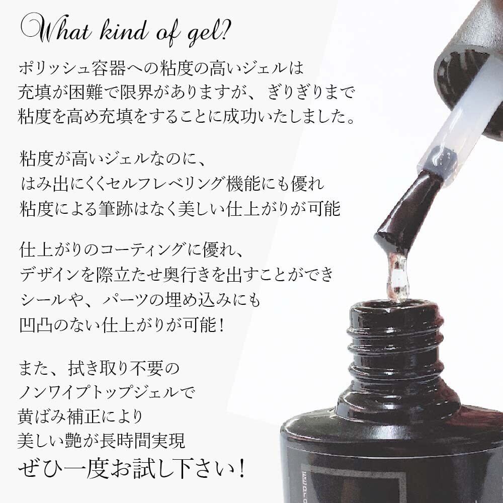 ポリッシュ容器への粘度の高いジェルは充填が困難で限界がありますが、ぎりぎりまで粘度を高め充填をすることに成功いたしました。ハードジェルに近い粘度により、過去にないほど硬めのジェルです。