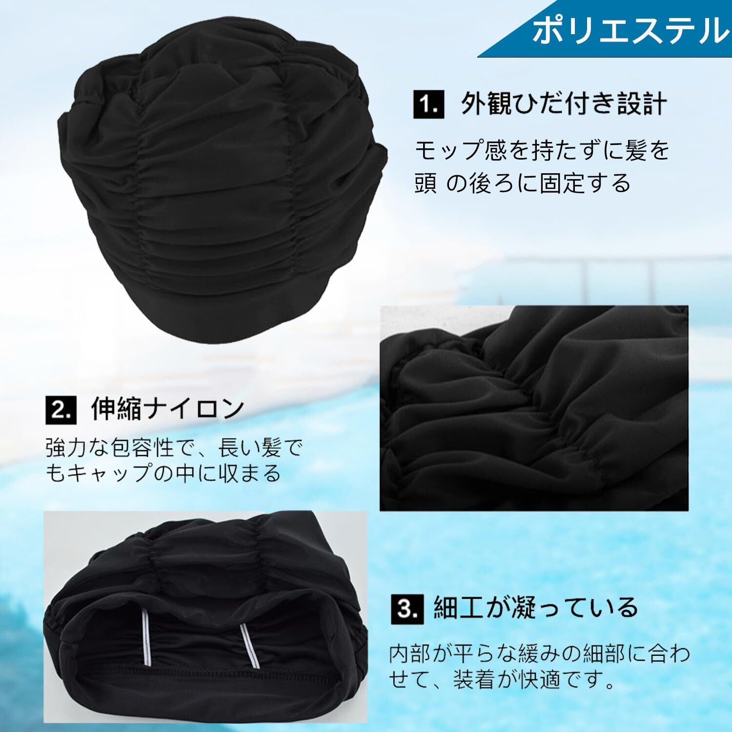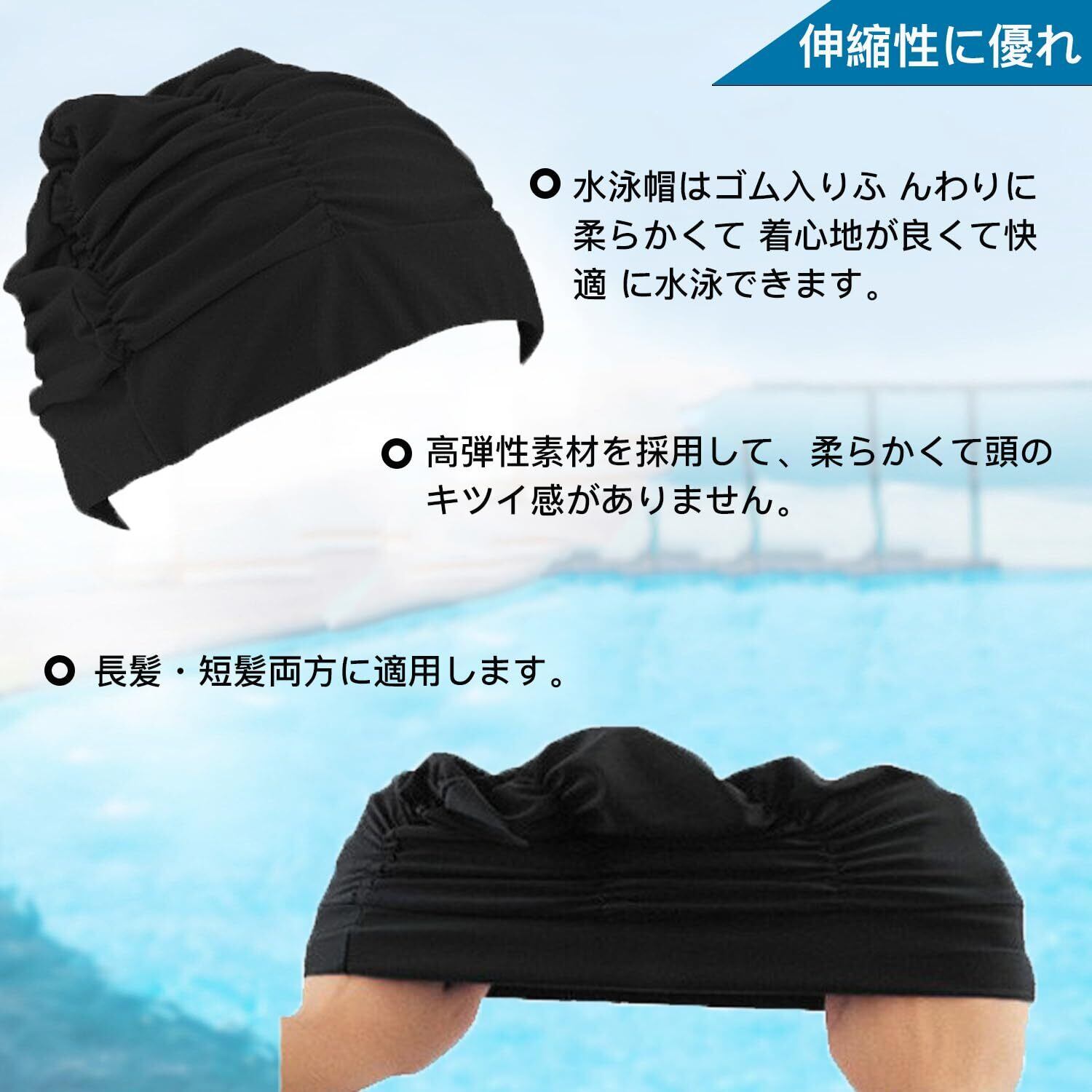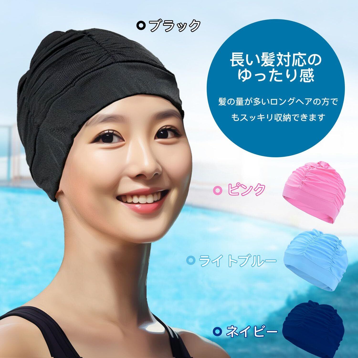 サムコス スイムキャップ レディース 容量大きめ 水泳帽 水泳スイムキャップ 締め付け緩め ロングヘアーに対応 水泳帽子 (黒)
