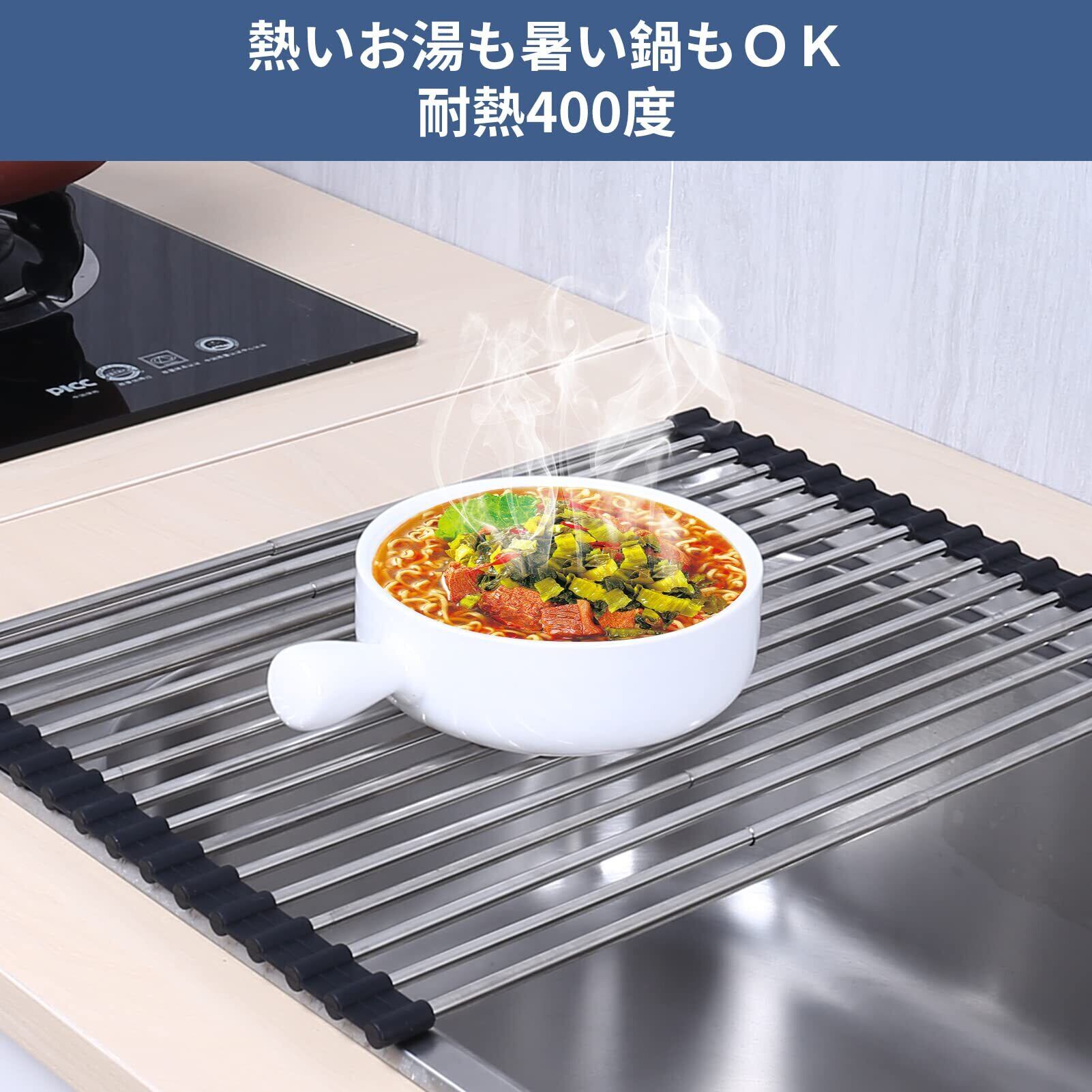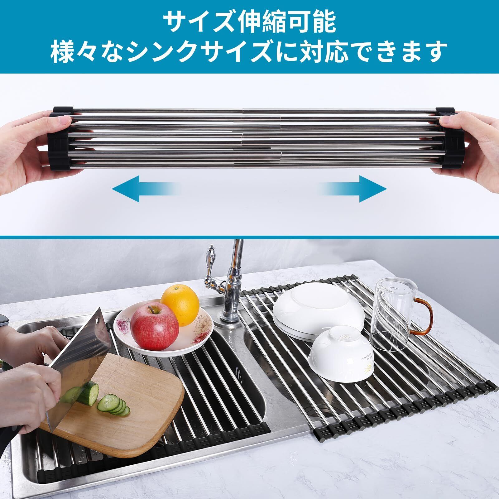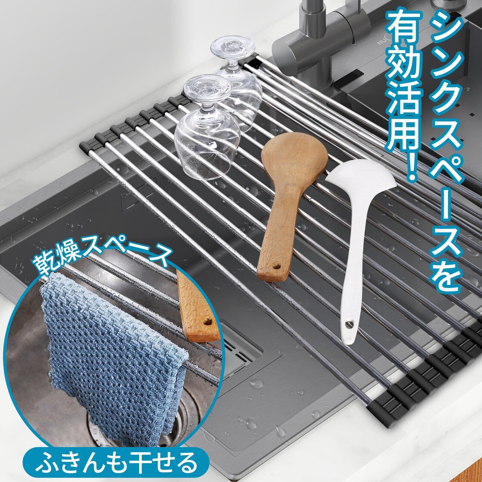 水切りラック 折りたたみ 伸縮タイプ水切り 抗菌 耐熱 錆びない 滑り止め サイズ調整可能 28-50cm 食器水切り 食器乾燥ラック 巻き収納 キッチン用品 (ブラック)