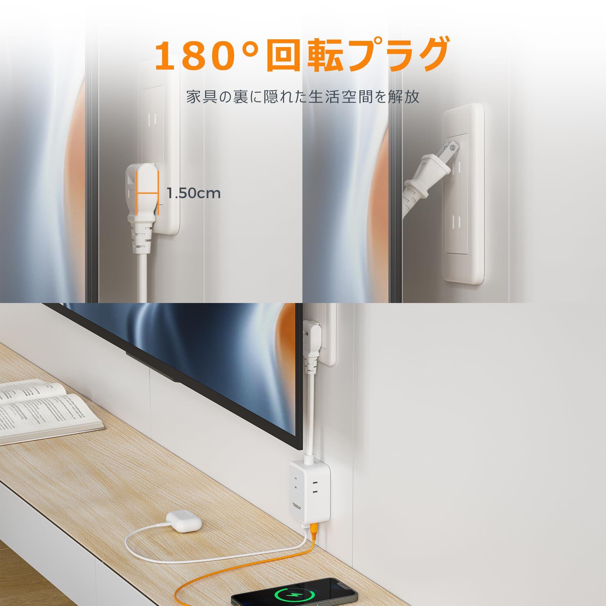 【一台6役/干渉しにくい】この延長コードは正面と左右に1口ずつACコンセントを搭載しているほか、USBポート(USB-A2、USB-C1)も3口用意されています。そのため、最大6台まで同時に充電が可能で、コンセントが足りないという問題を解決します。また、ACコンセントが左右に分散しているため、使用時の干渉を防ぎながら接続可能です。
