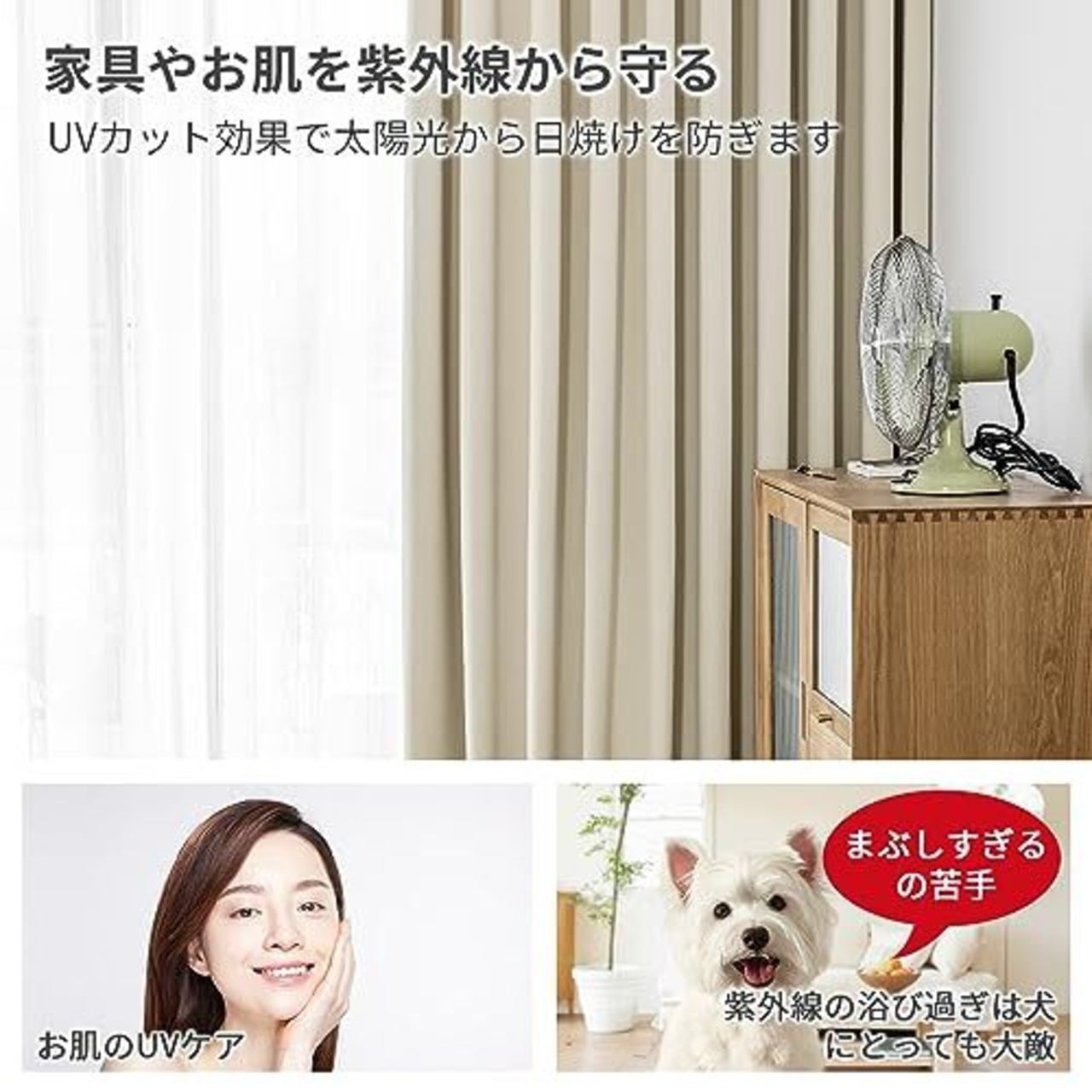 【ペットと人のためUVカット】このカーテンを使えば、紫外線をカットすることによってお肌も守るし、家具の日焼けや色褪せ防止にも働きます。また、犬の目は人間よりも紫外線に弱いと言われております。紫外線は犬の皮膚にもダメージを与えるので、浴び過ぎなら犬にとっても大敵です。そのため、UVカット効果で大切なペットを紫外線から守れます。