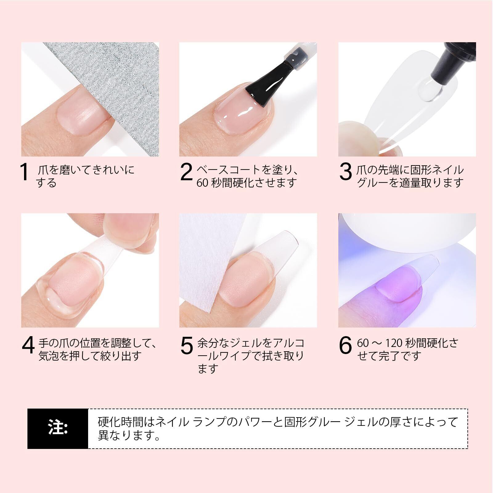 硬化が必要:TOMICCA クリア ジェルネイルグルーをネイルチップに塗布し、爪に貼り付けた後、乾燥してしっかりと貼り付くまでネイルランプの下で 60 秒硬化する必要があります。