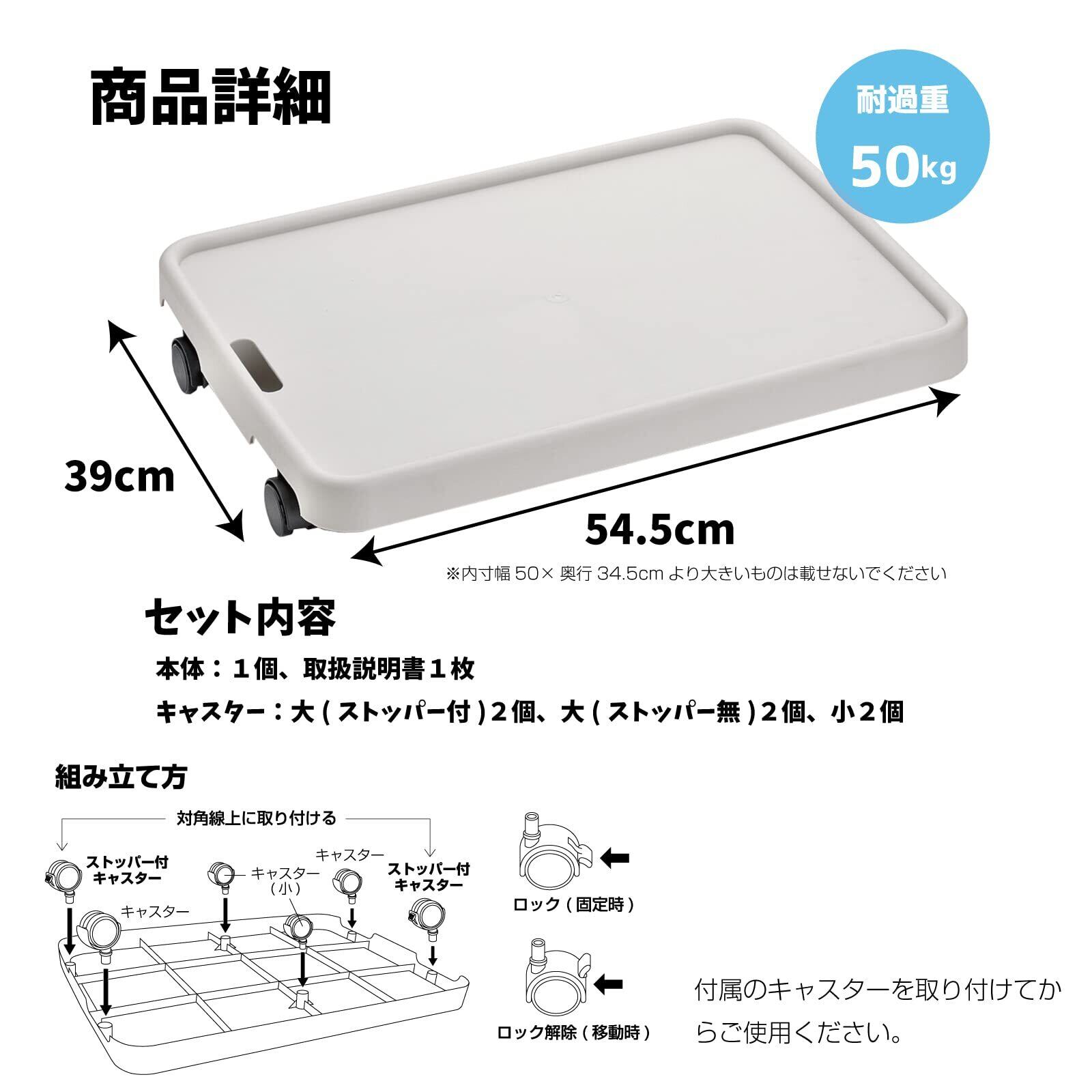 ●本体サイズ:幅54.5×奥行39×高さ8㎝●内寸:幅50×奥行34.5cm※内寸よりも大きいものは載せないでください。●耐荷重:50㎏●材質:ポリプロピレン,キャスター:ポリプロピレン、ポリカーボネート(耐熱温度110℃/耐冷温度-20℃)●取扱説明書あり●原産国:日本