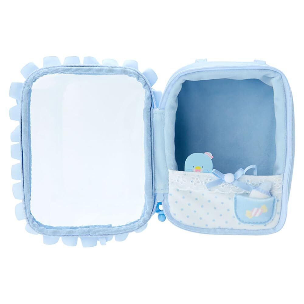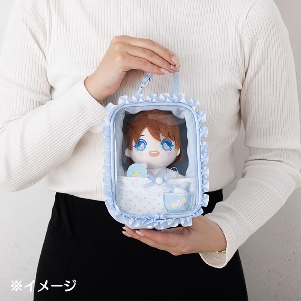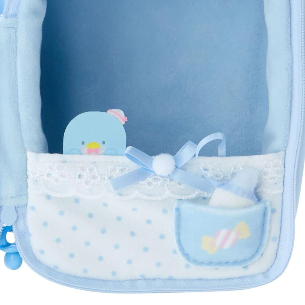 お手持ちのぬいぐるみを入れて持ち歩けるポーチ。ファスナーチャームはおしゃぶり形。ポケットには哺乳瓶形パーツ付き。ストラップでバッグの持ち手などに取り付け可能。内寸:約縦14×横11×奥行6cm