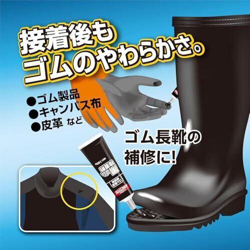 柔軟性:接着後もゴムのやわらかさがあるので、 長靴などのゴム製品や、柔軟さが必要な部分の接着・補修が可能です。