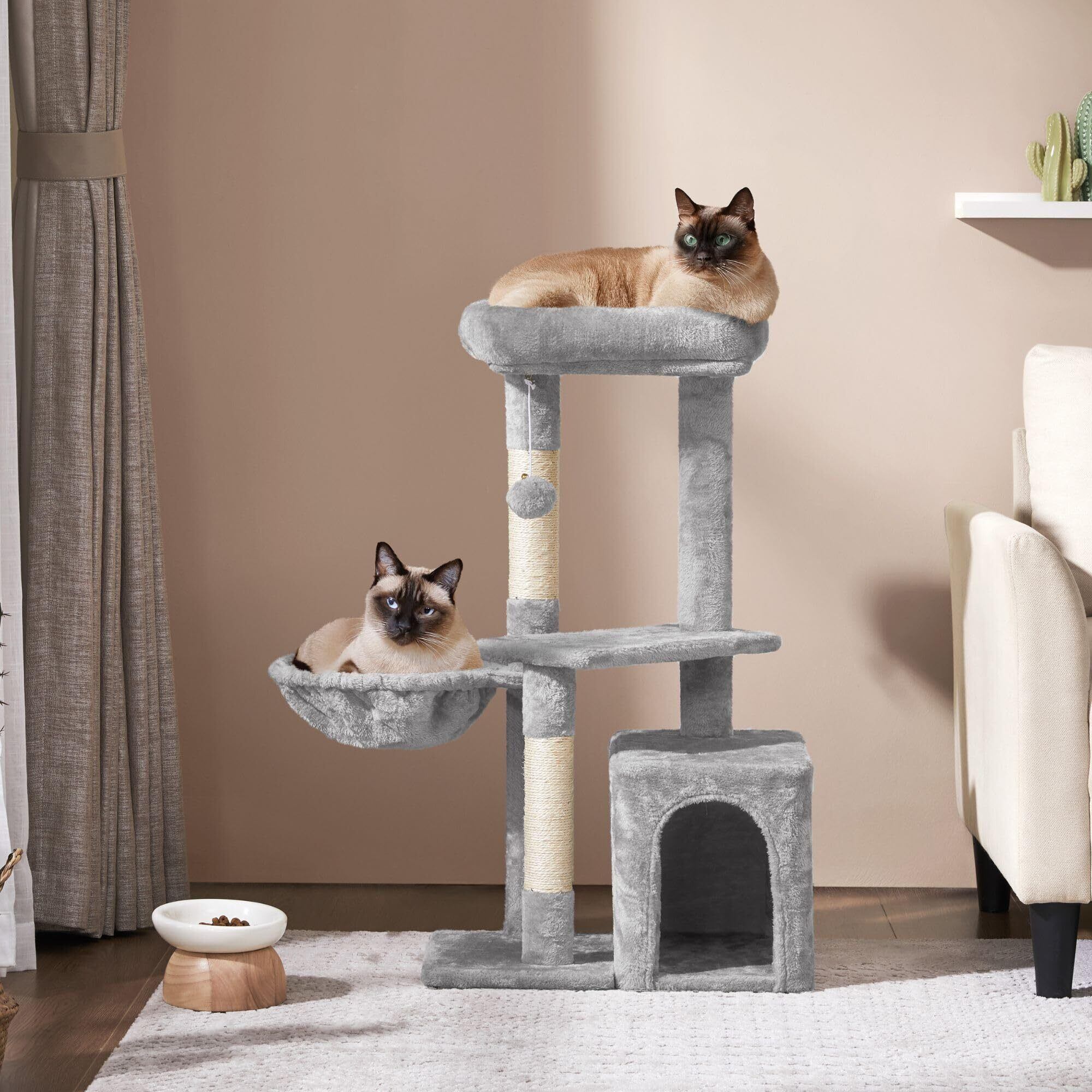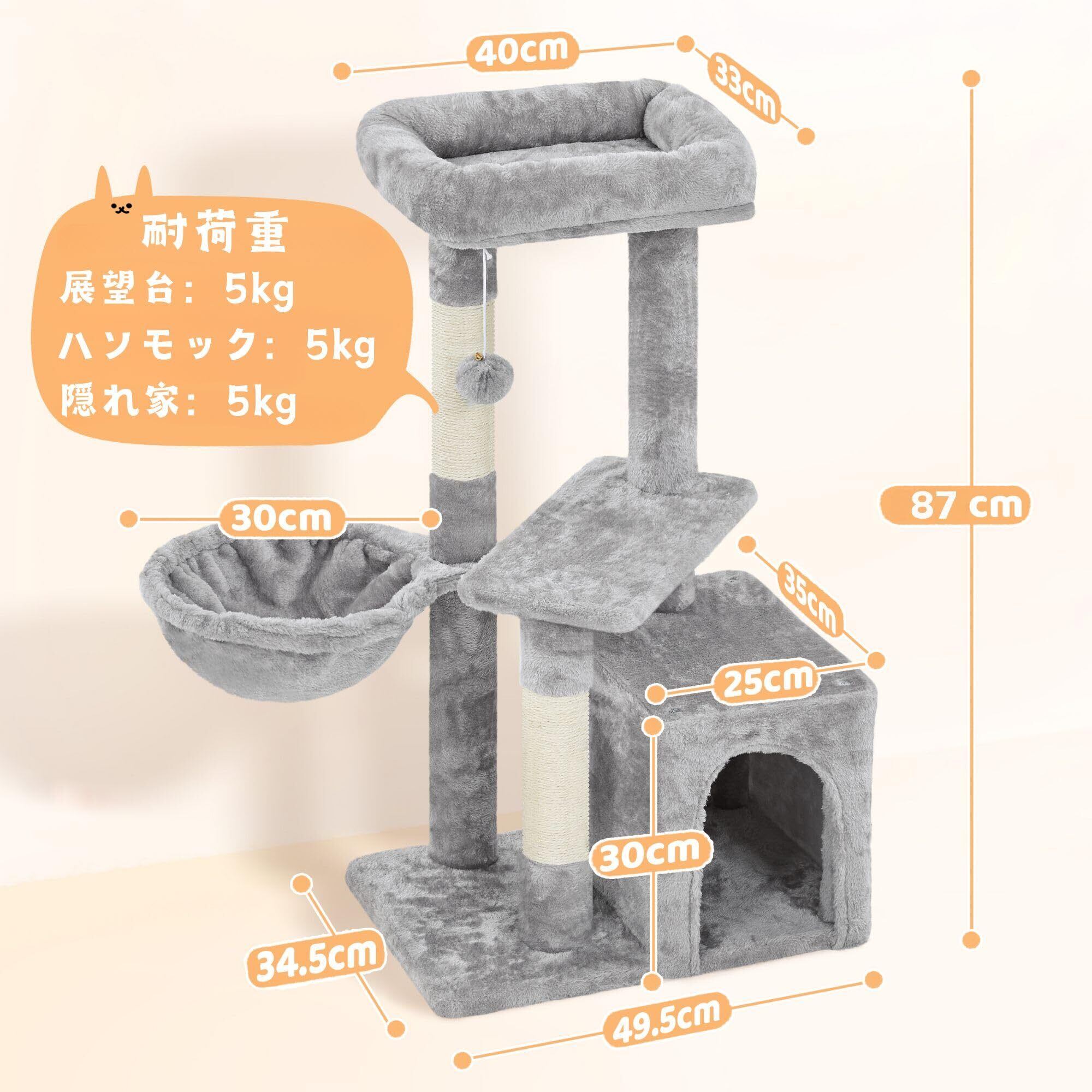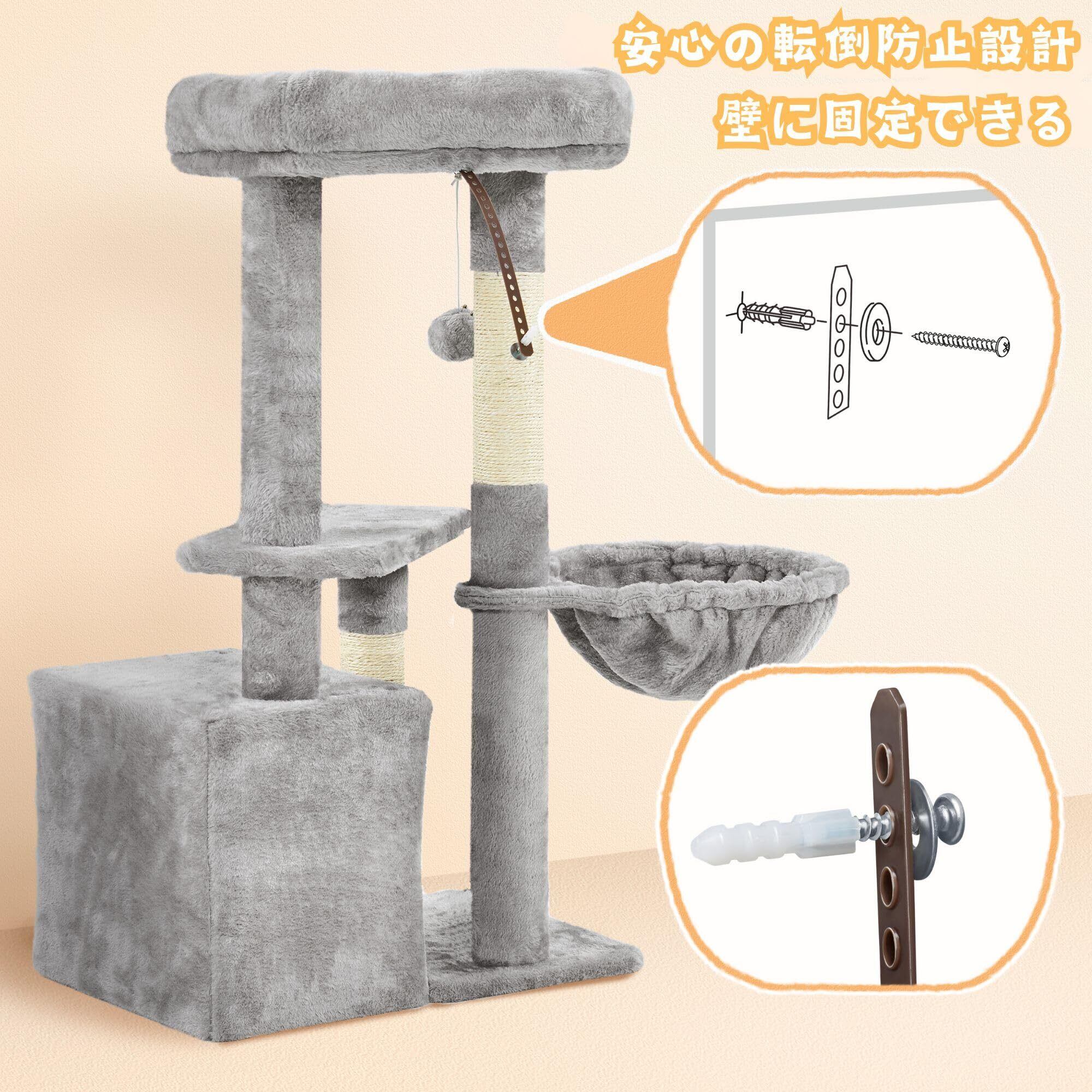 Yaheetech キャットタワー 中型 シニア猫 子猫 多頭飼い 猫タワー 高さ87cm 低め 爪とぎポール 広いハウス ハンモック おもちゃ付き 天然サイザル 転倒防止 (ライトグレー)