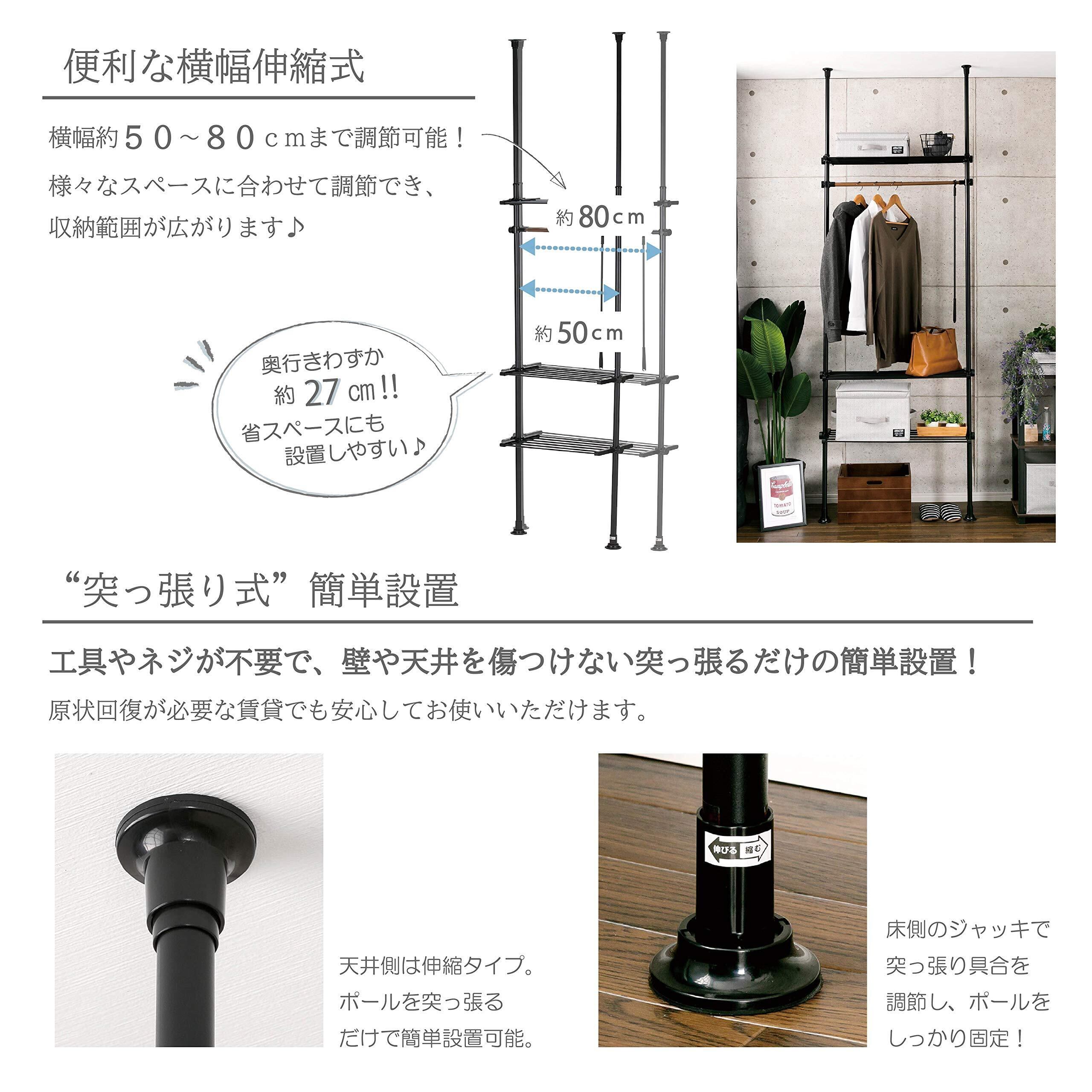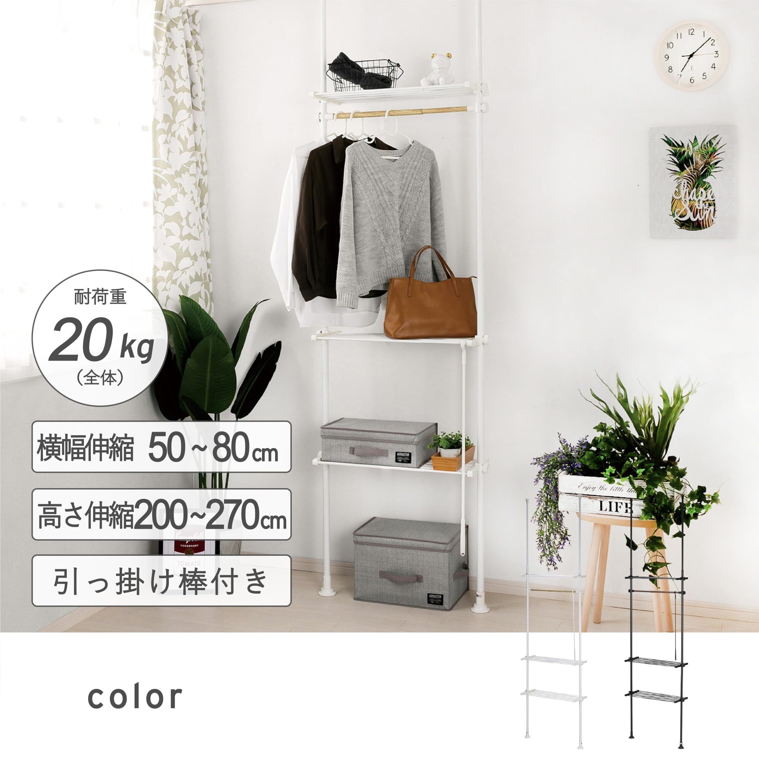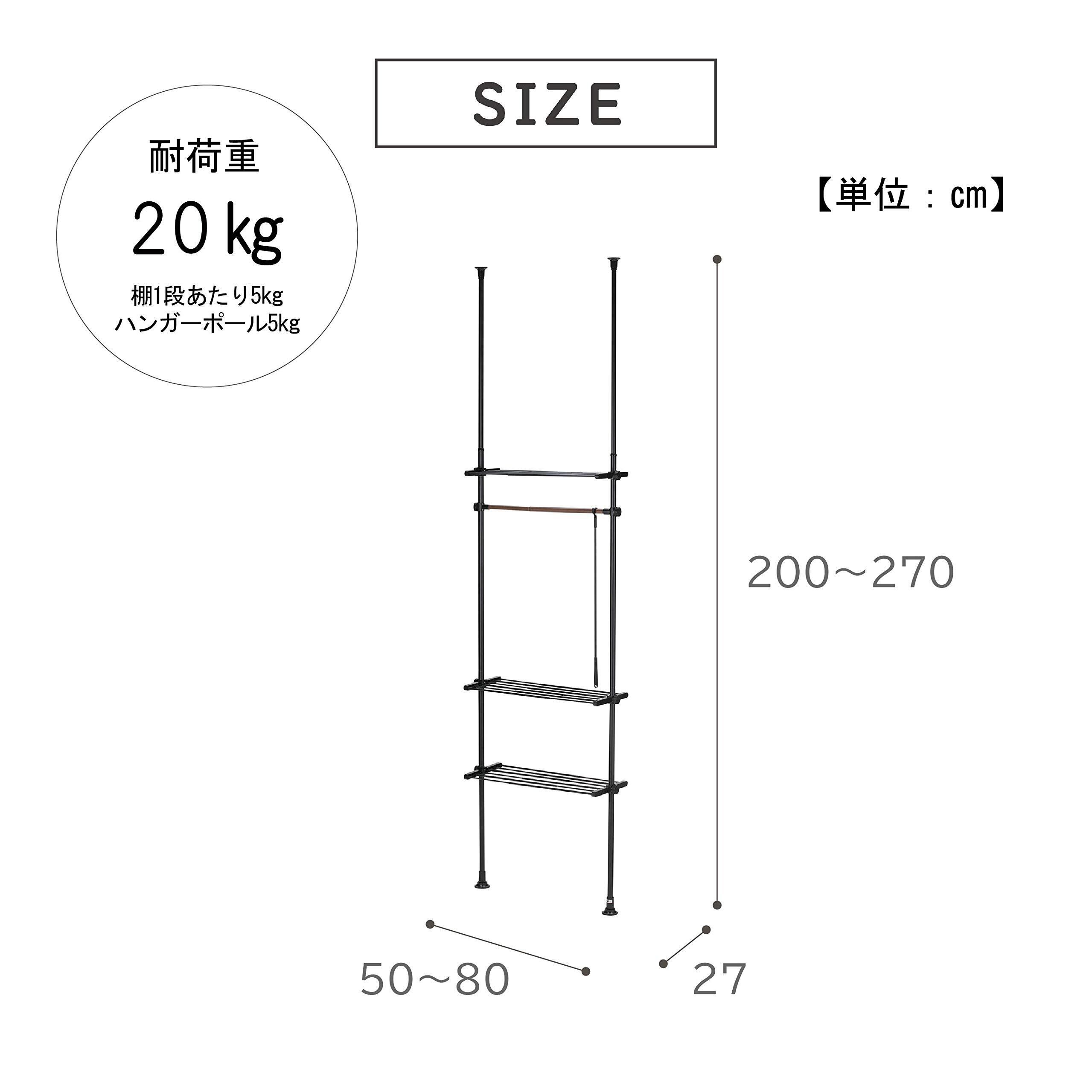 【サイズ】50~80×27×200~270㎝ 【商品重量】4.1㎏ 【耐荷重】20㎏/棚1段あたり5㎏・ハンガーポール5㎏