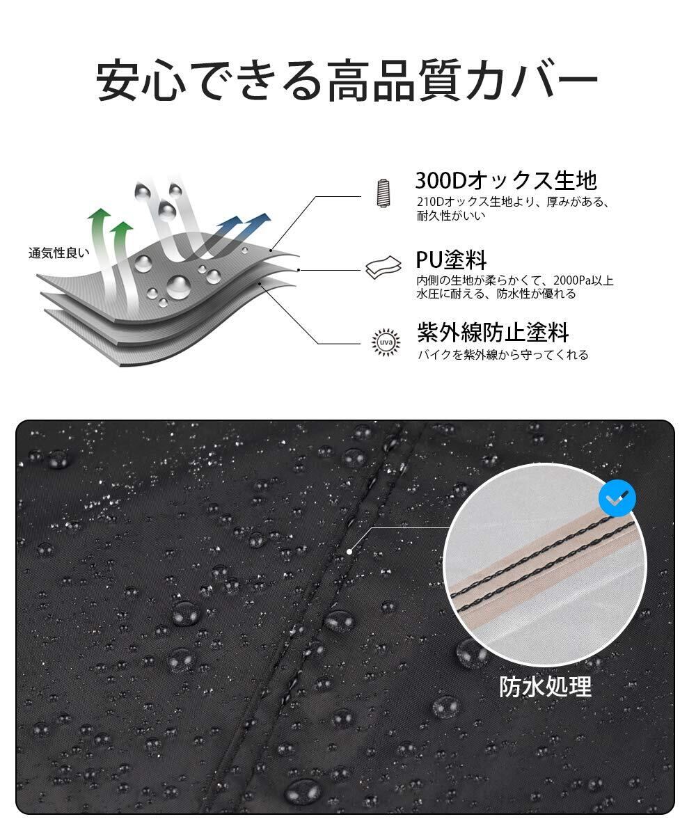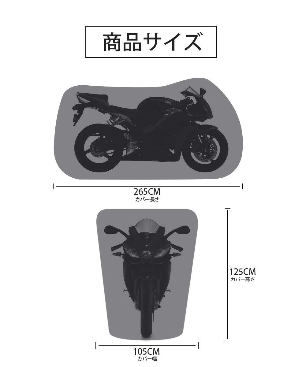 【製品仕様】サイズ:265*125*105cm、ほぼ様々すべてのバイクをカバー可能、専用の収納バッグがついているため、持ち運びやすい。【ご注意】生地には防水加工、縫製糸には撥水加工を施してありますが、カバーを車体に付ける時、凹みがあるなら、雨水を長時間に凹みに貯まると、車体が濡れる場合がありますため、凹みがないようにカバーを車体につけてください