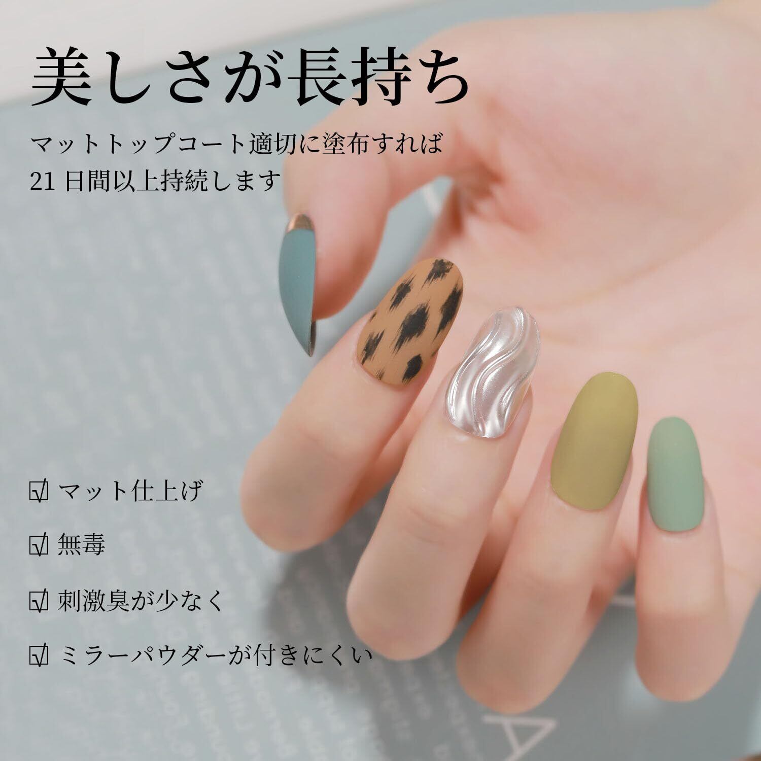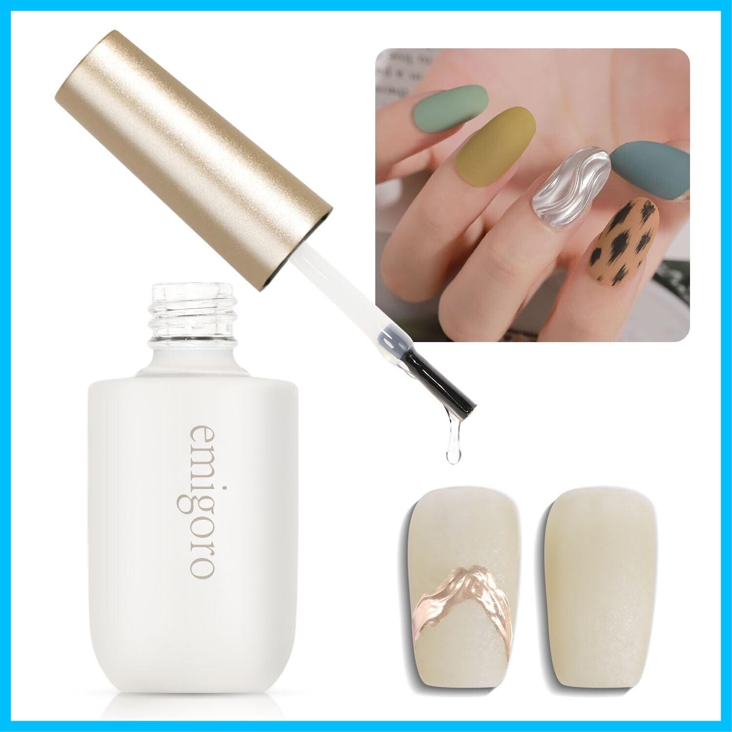 「パウダーとの相性抜群」ミラーパウダーを付けたい場合、従来のマットコートは余分なパウダーが結構残ってしまうものが多かったですが、emigoroのマットトップジェルはミラーパウダーと相性のいい、従来のものよりパウダーが飛び散りにくいです。仕上がりが綺麗で時短にもなります。