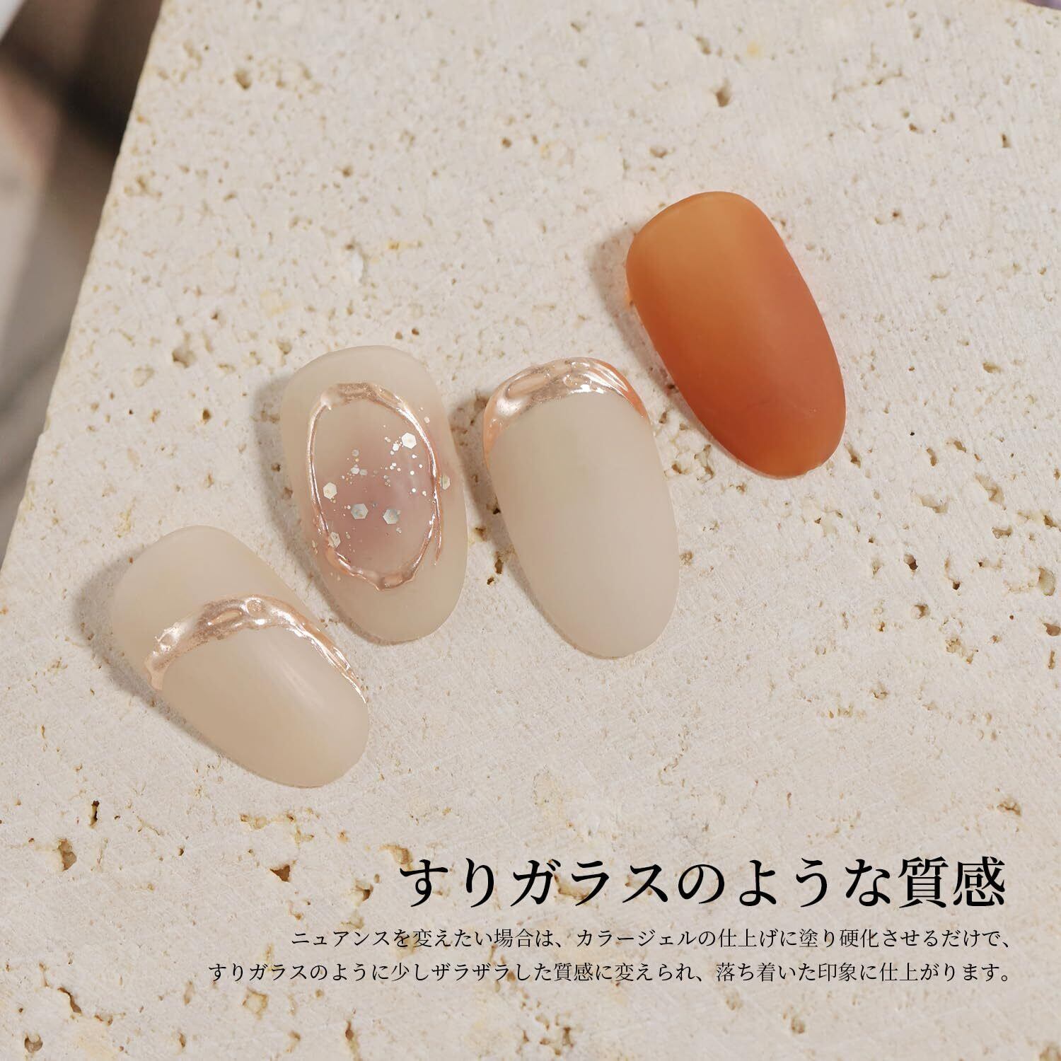 「すりガラスのような質感」ニュアンスを変えたい場合は、ジェルネイルの仕上げに塗り硬化させるだけで、すりガラスのように少しザラザラした質感に変えられ、落ち着いた印象に仕上がります。くすみカラーやすりガラスのようにマットな質感を演出できるマットトップジェルです。