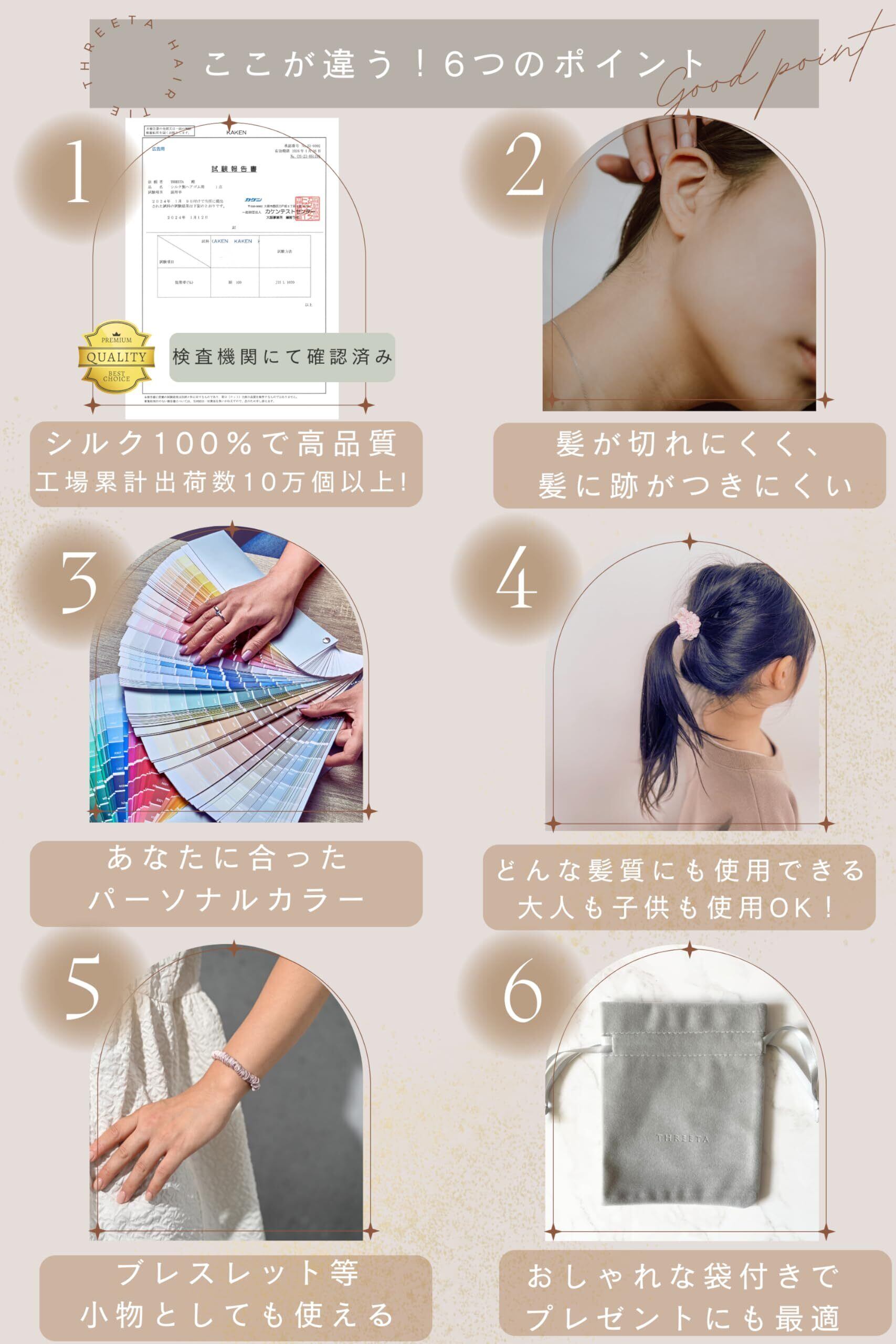 【検査済みの100%高品質シルク】国内および国外で実施された厳格なW検査により、本物のシルク100%であることが証明されています。また、累計出荷数100,000個以上生産されている工場で品質も安心。シルクは髪と同じタンパク質成分でできており、髪の負担が少なく、髪のダメージを抑えます。さらに髪に絡みにくいので結んでいる時や外す時に痛みを感じにくく、跡がつかない等良い点がたくさん。トータルビューティーアドバイザーも絶賛しているTHREETAのシルクヘアゴムで、シルクの素晴らしさを是非実感してみてください