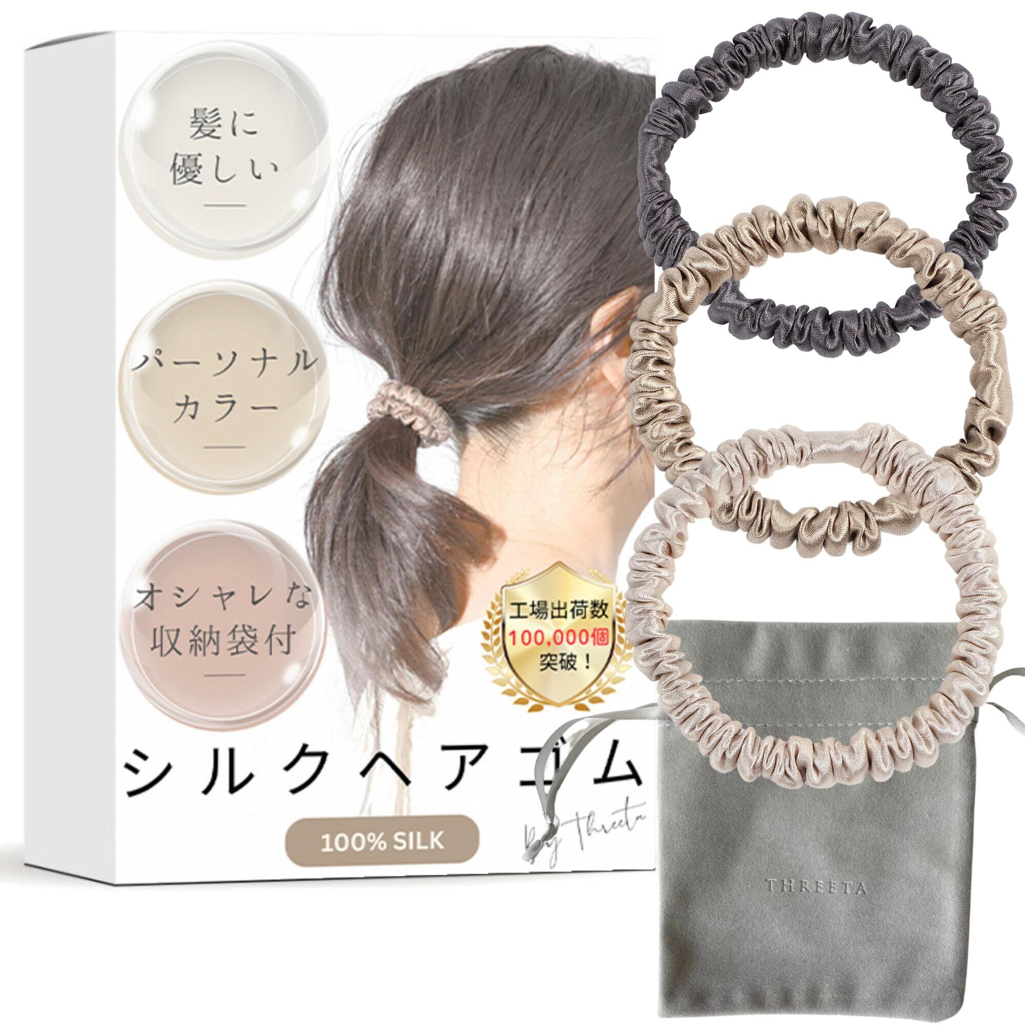 【雑誌掲載商品】 ヘアゴム シュシュ シルク 100% 髪ゴム 【ビューティアドバイザー監修】 パーソナルカラーでも選べる ヘアゴムで美髪 収納袋付き 3個セット (グレージュ)