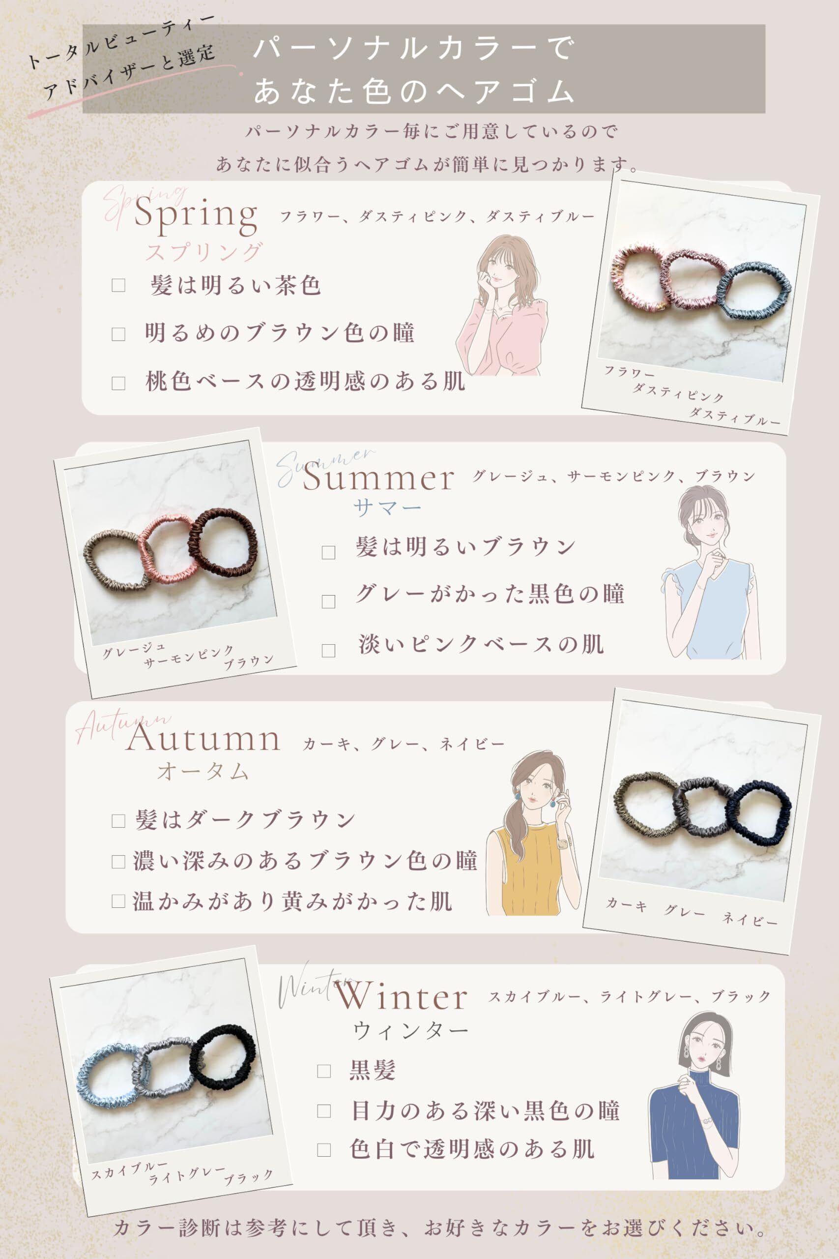 【パーソナルカラーで似合う色が簡単に見つかる】パーソナルカラー毎に選べるセットをご用意しました。肌や髪に最適な似合う色合いを簡単に見つけることができます。さらに、パーソナルカラーに限らず、ベーシックやベージュなど人気のカラーバリエーションも豊富に揃えました。お気に入りの色を見つけて、その日の気分や個性に合わせてヘアセットを楽しんでください。自分色で彩られたシルクシュシュが、あなたの魅力を際立たせます