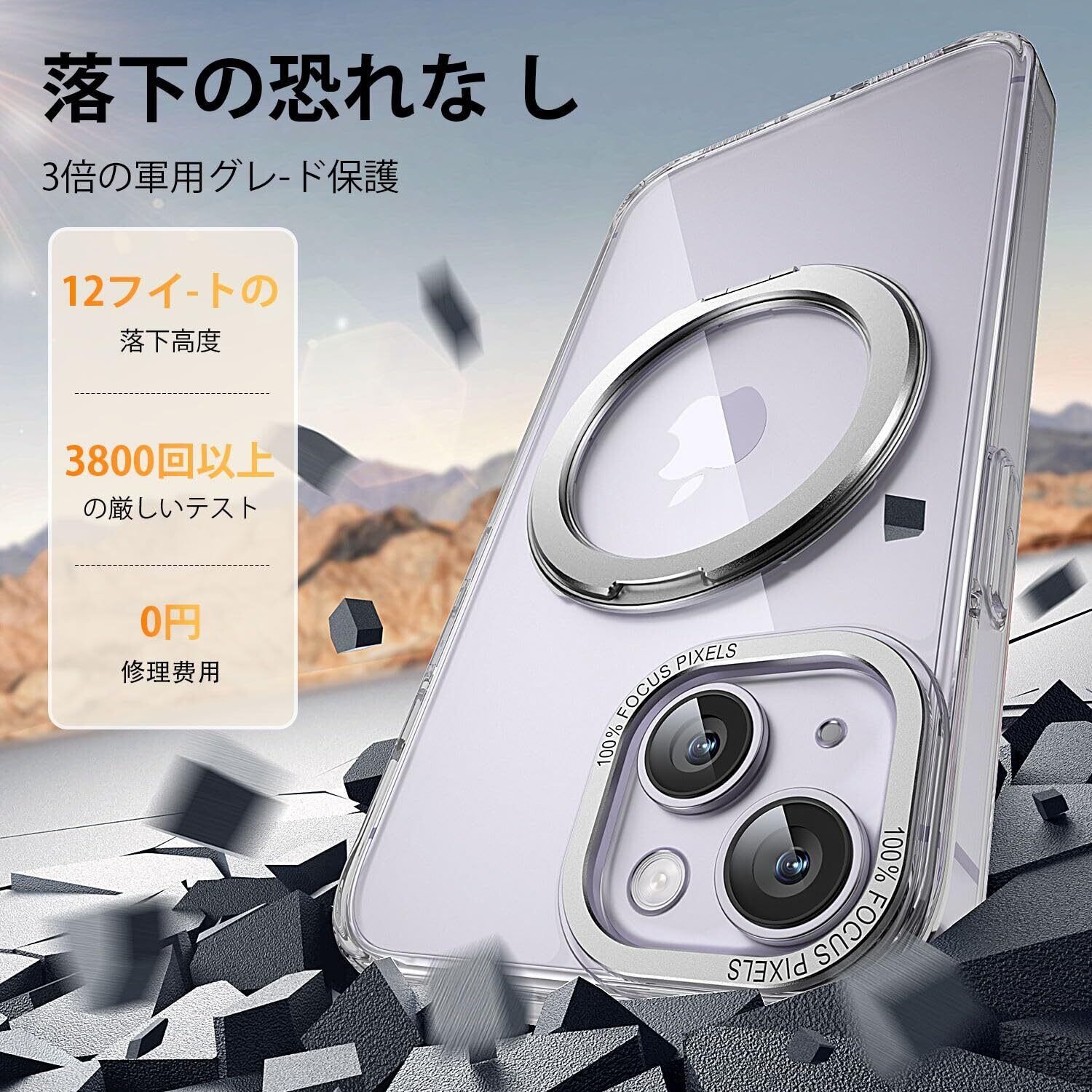 【耐衝撃】いphone14 ケース/いphone13 ケースは衝撃を受けやすい大事なカメラに、本体よりわずかにソフトなTPUで高く設計しており、不意に落下してしまいました際の衝撃をある程度に吸収し、地面に置いた場合でもレンズが直接に触れず、傷つきにくくなっています