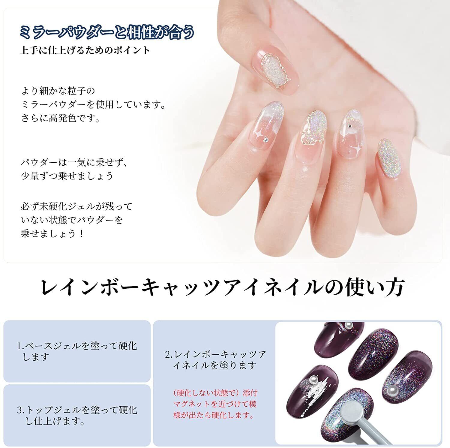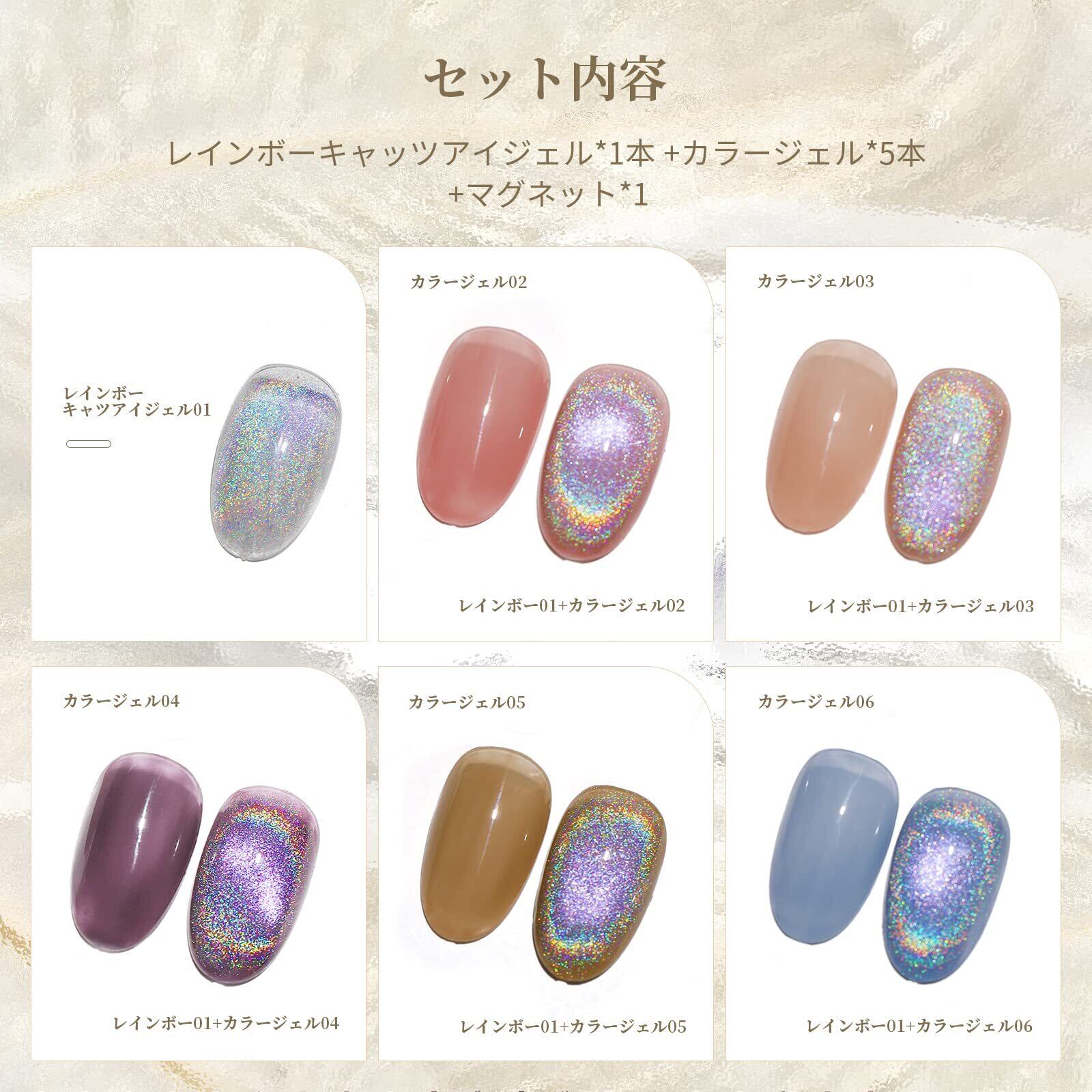 **磁石が付く、別途購入する必要がありません。10ml 6色セット:レインボーキャッツアイジェル*1本+カラージェル5本 ①特徴:マグネットを当てたところから光が逃げるようにサークルの光の輪が出来ます