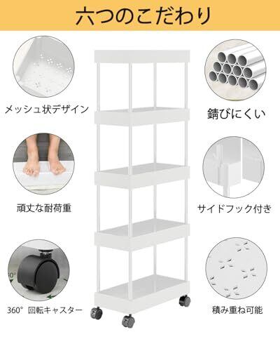 【3段·4段·5段から選べるようになった】素材はメッシュカゴがポリプロピレンとポリエチレンで、フックがABS樹脂とポリエステルで、キャスターがポリプロピレンとポリエチレン合金鋼で、パイプが合金鋼です。高級な材質は採用なので、高い安定性を誇ります。スリムボディーをして、部屋の隙間に自在に配置されています。スタッキング式なので、お好みで1段から5段まで自由に組み立てられます。