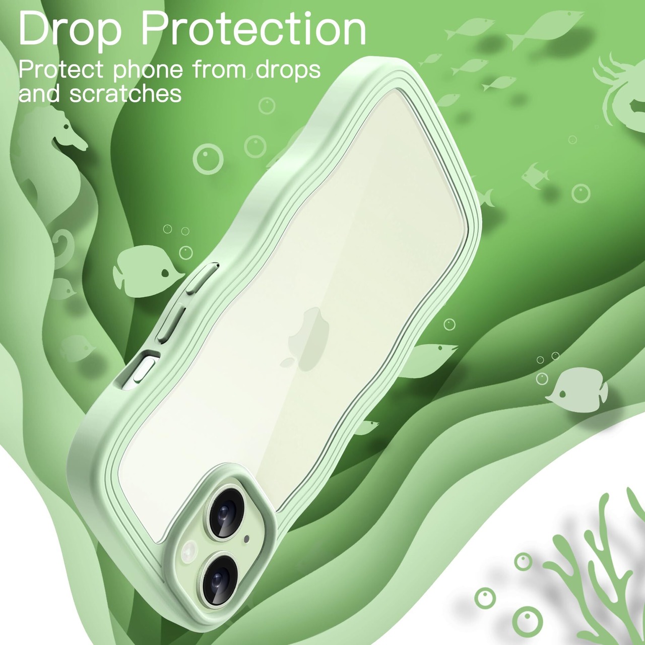 JEDirect iPhone 15 6.1インチ用 かわいい ケース 波状フレーム うねうね 耐衝撃 スマホカバー 女性用 女子向け クリア ハードPCバック (グリーン)