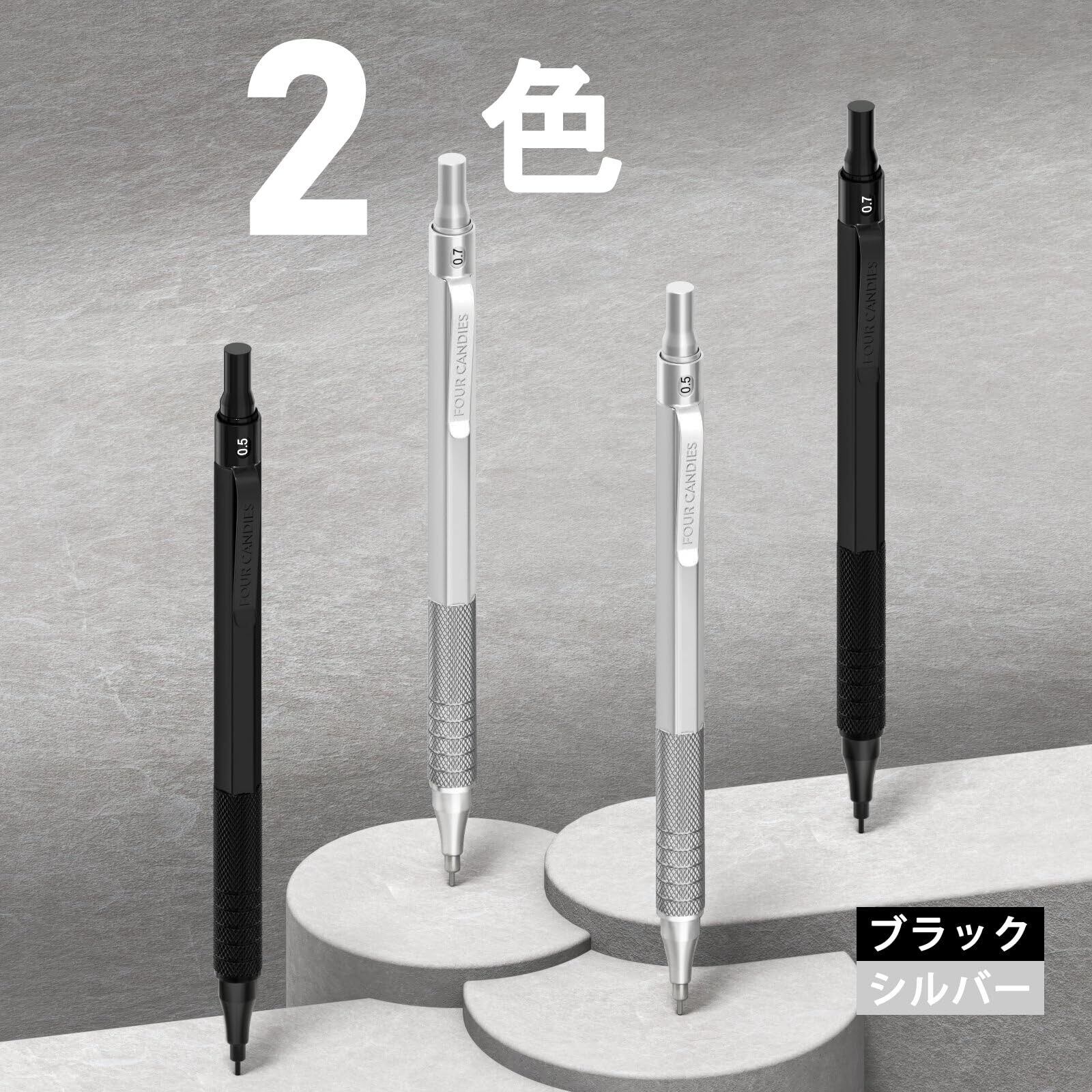 Four Candies メタルシャープペンシル 4本セット 0.5&0.7 mm シャーペン 480本HB替芯 消しゴム ケース付 文房具セット ブラック&シルバー