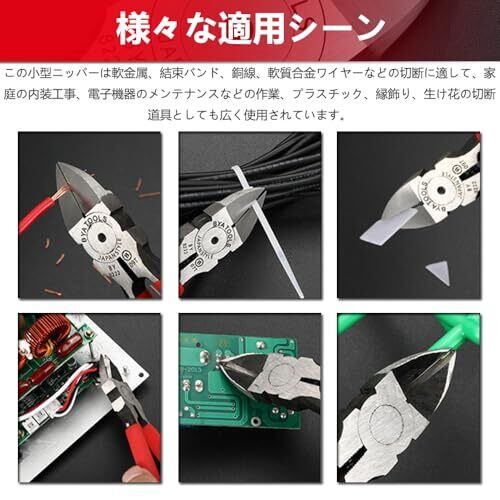 【様々な適用シーン】この小型ワイヤーカッターは軟金属、結束バンド、銅線、軟質合金ワイヤーなどの切断に適して、家庭の内装工事、電子機器のメンテナンスなどの作業、プラスチック、縁飾り、生け花の切断道具としても広く使用されています。