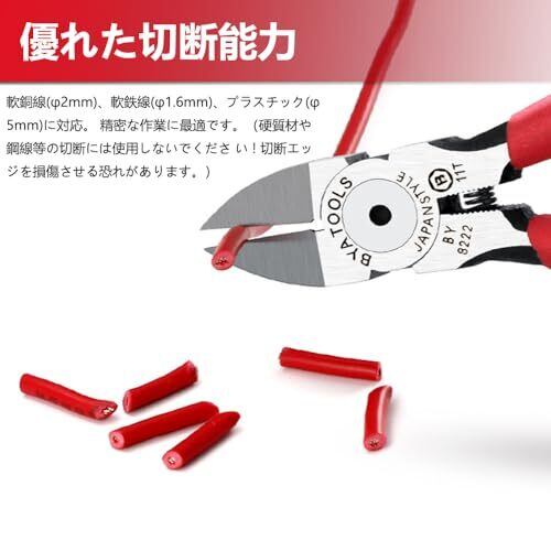【優れた切断能力】 軟銅線(φ2mm)、軟鉄線(φ1.6mm)、プラスチック(φ5mm)に対応。 精密な作業に最適です。(硬質材や鋼線等の切断には使用しないでくださ い ! 切断エッジを損傷させる恐れがあります。)