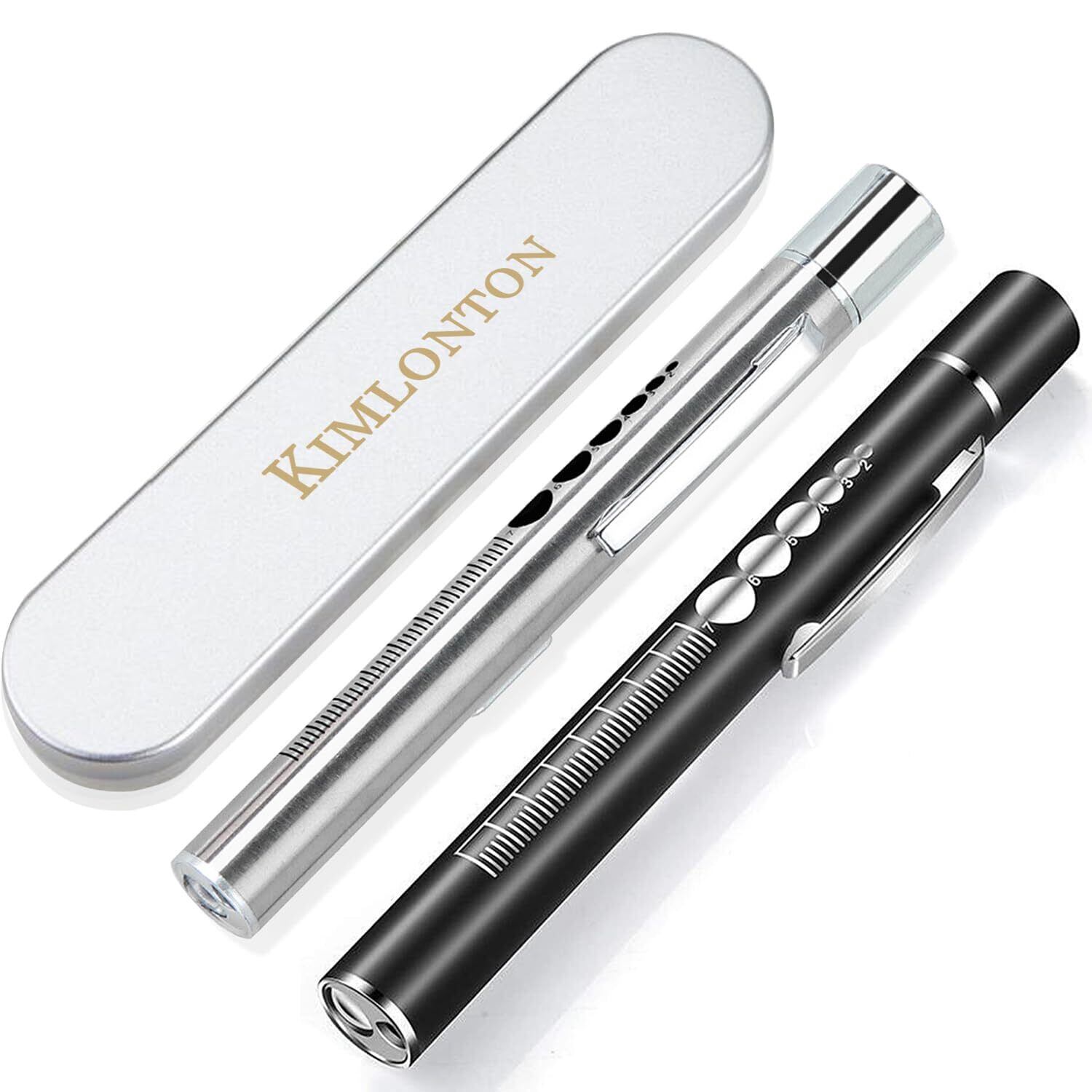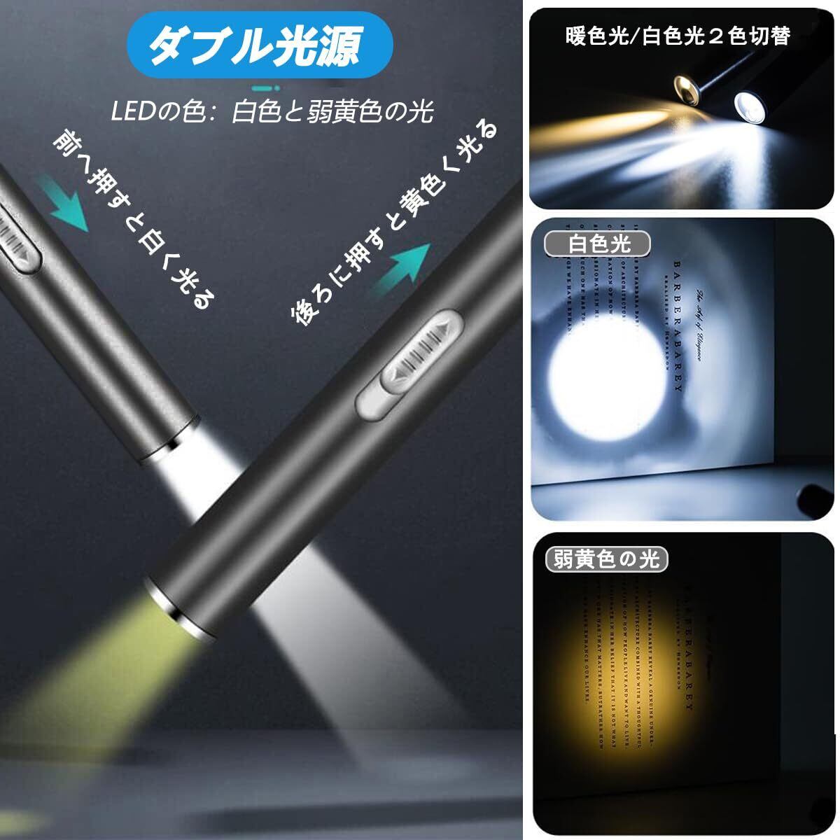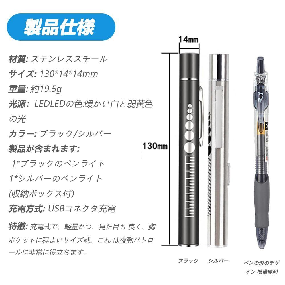 KIMLONTON ダブル光源 懐中電灯 小型 LED USB充電式 超軽量 高耐久 クリップ付き シルバーとブラック ペンライト2個セット 携帯便利 キャンプ アウトドア用ミニハンディライト 収納ボックス付