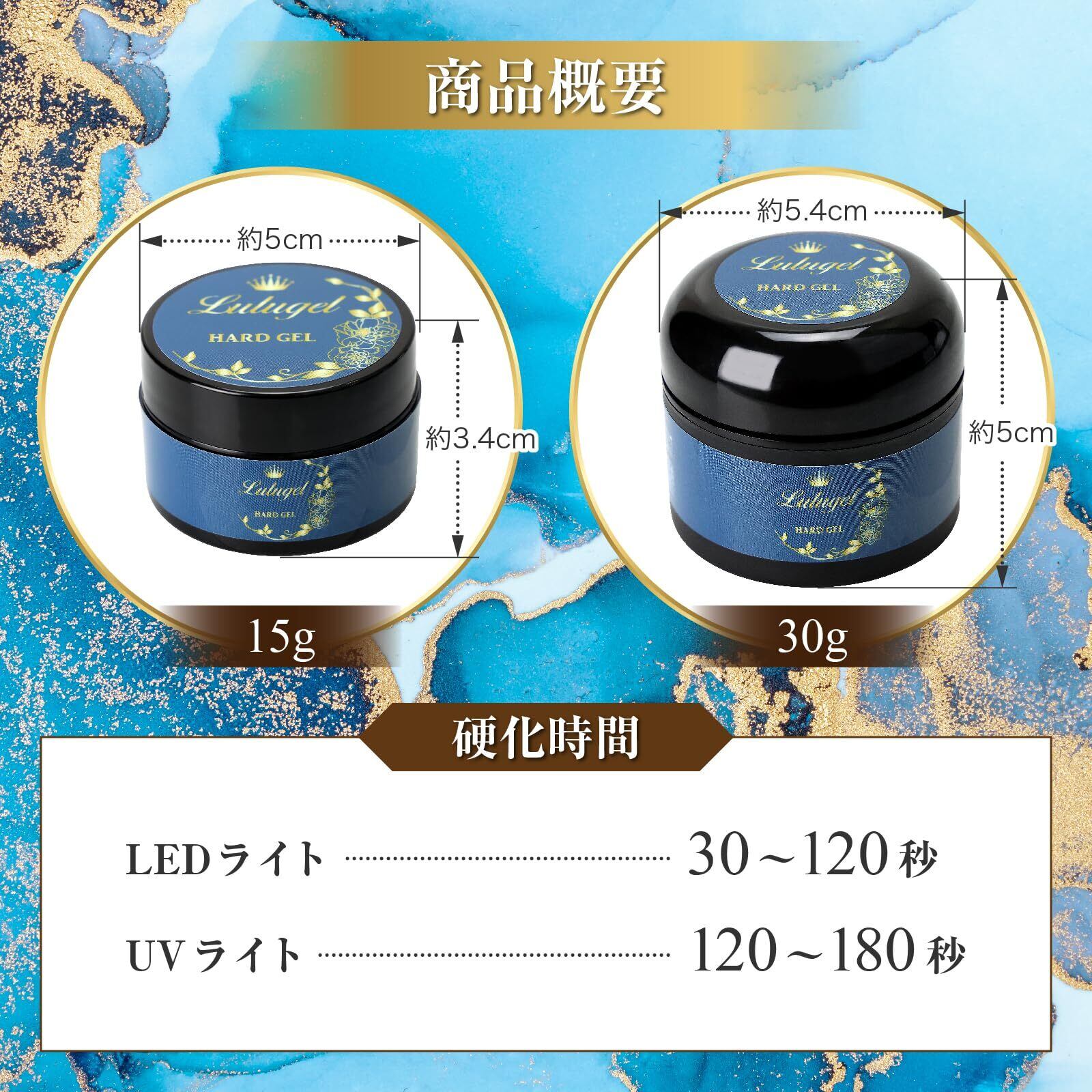 【LULUGEL ハードジェル】内容量:15g 内容量:30g 区分:雑貨 硬化時間 LED:30秒~、UV:90秒~ トップ/厚みだし/長さだし