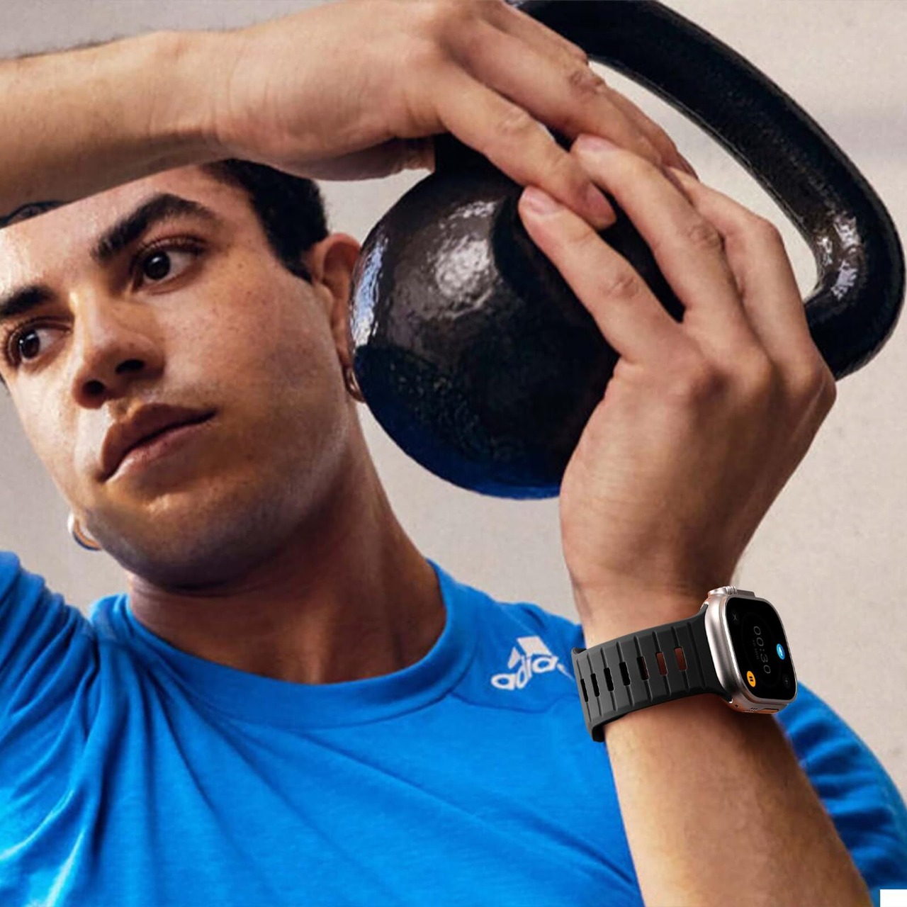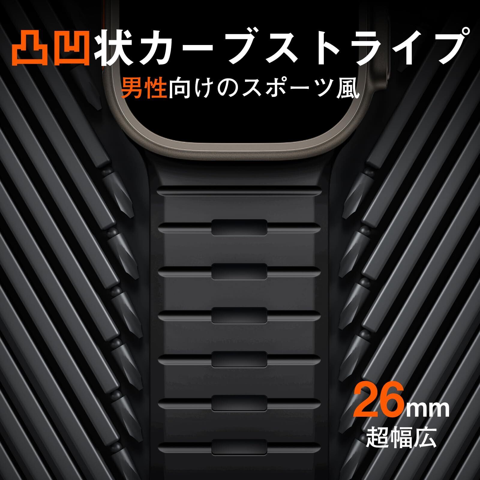 【独特なスポーツスタイル】Apple用 Watch Ultraや大画面のApple用 Watchに対応するようデザインされた、男性向けのアップルウォッチ用 バンド スポーツなスタイルを演出します。緩やかな凸凹状のカーブと通気孔が手首により多くの空間を提供し、通気性を向上させます。幅広い26mmのバンドは、スポーツやアウトドアのアクティブな雰囲気を演出します。また、手洗いやスポーツ中の汗から手首を保護します。