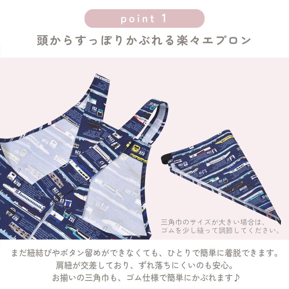 一人で簡単にかぶれるおそろいの三角巾付き。三角巾の後ろはずり落ちにくいゴム仕様。サイズが大きい場合は、ゴムを少し縫って調節して下さい。